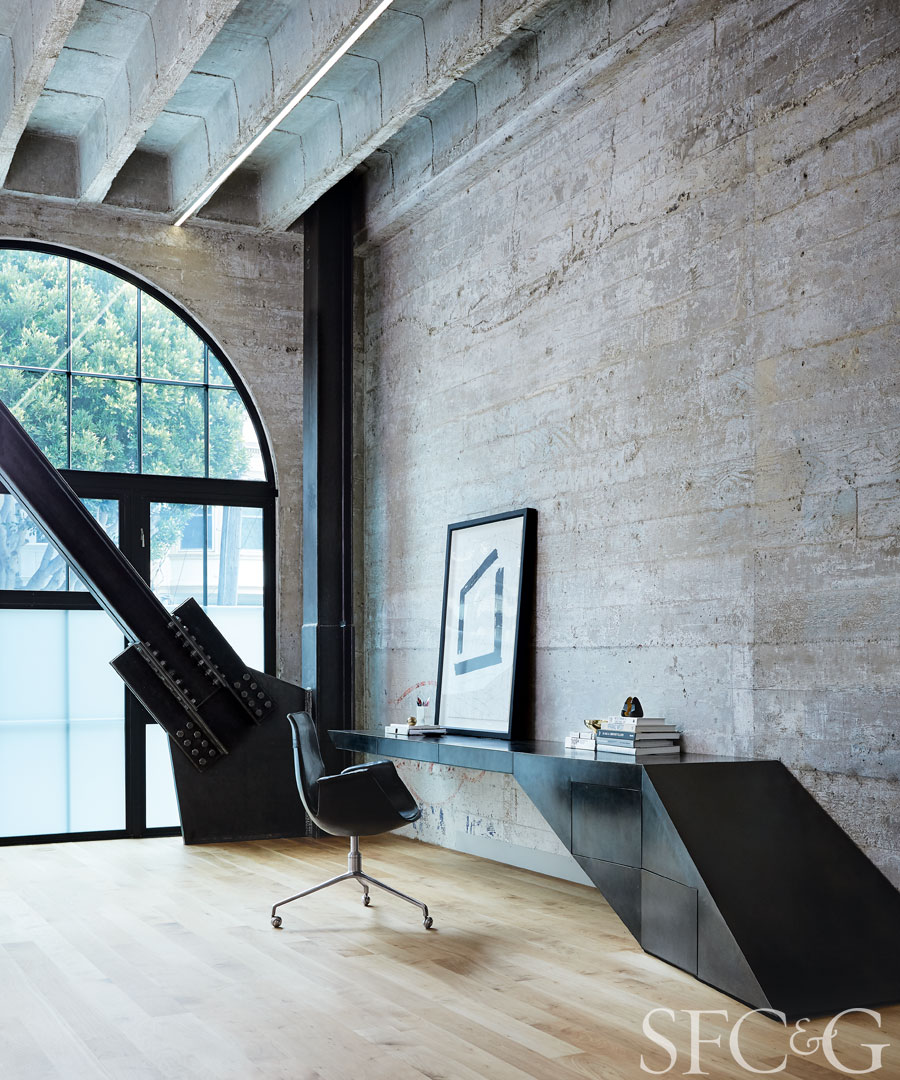OPA designed the custom desk, which is finished in blue, hot rolled steel. The 1950s black leather Bird chair is through Coup d’Etat.
