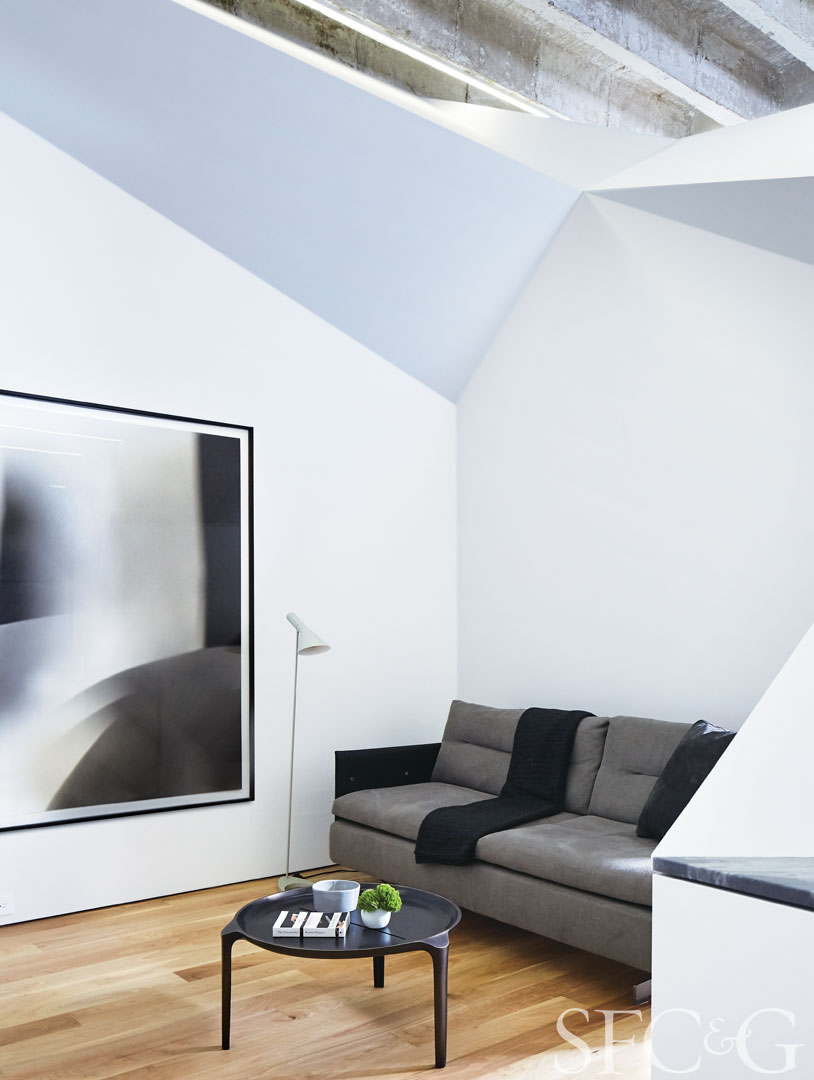 Sofa is Minotti; coffee table is Glasitalia through DZine. Speakers are by Franco Serbin.