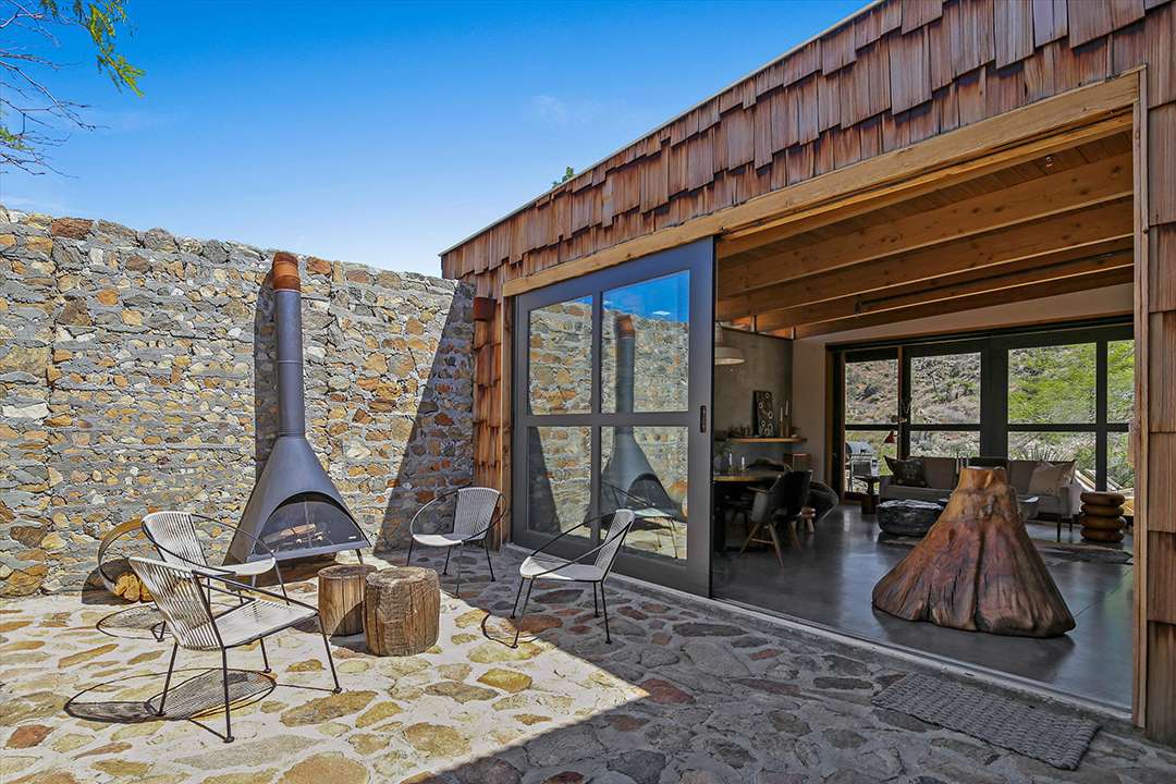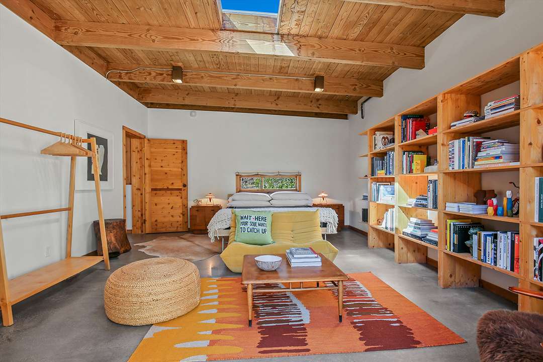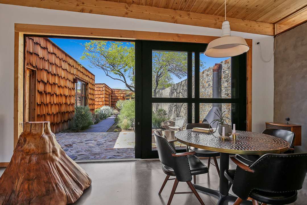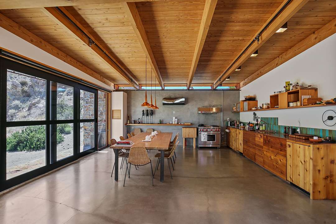 But, perhaps his largest work of art is this Joshua Tree home, which served as his personal residence and studio. Seamlessly sited in the rugged land around it, the home is encased in two hand built stone walls, creating an ultra tranquil and private oasis. The inside of the home ties into the environment around it as well, featuring tons of natural wood and cement while as well as large sliding glass doors that open into the serene courtyard or out to mountain views.