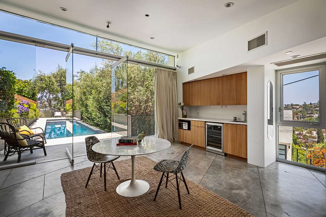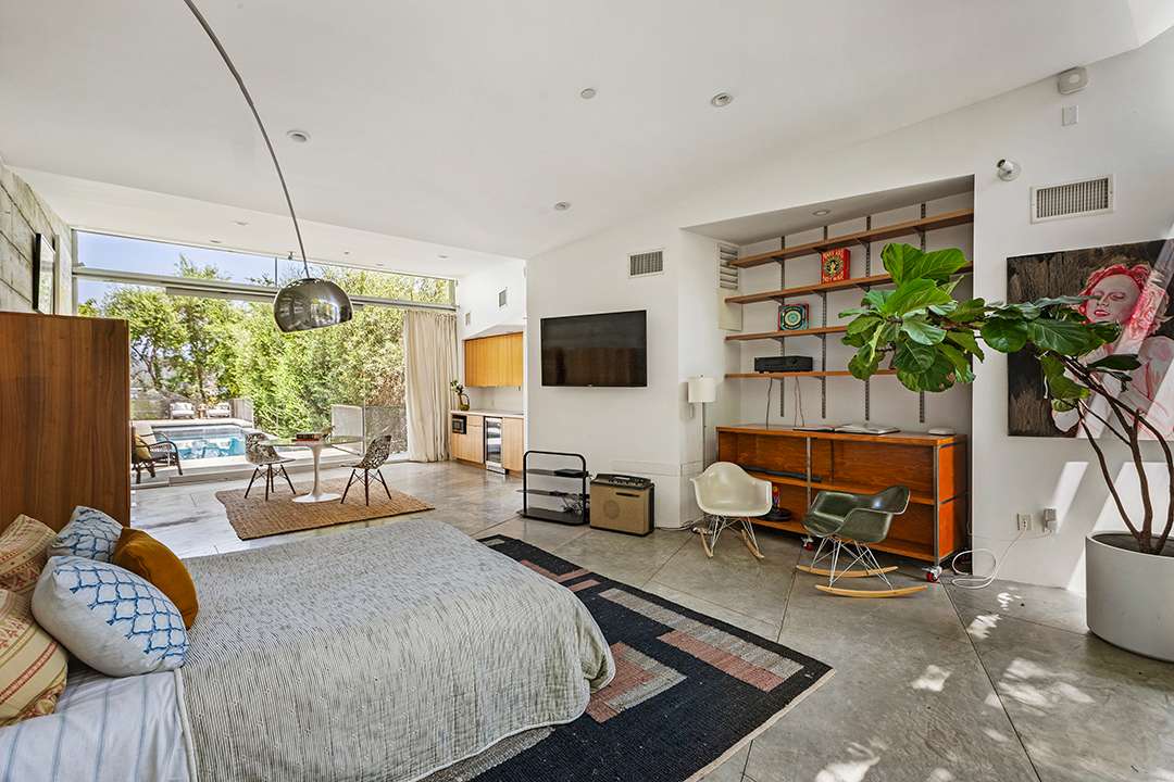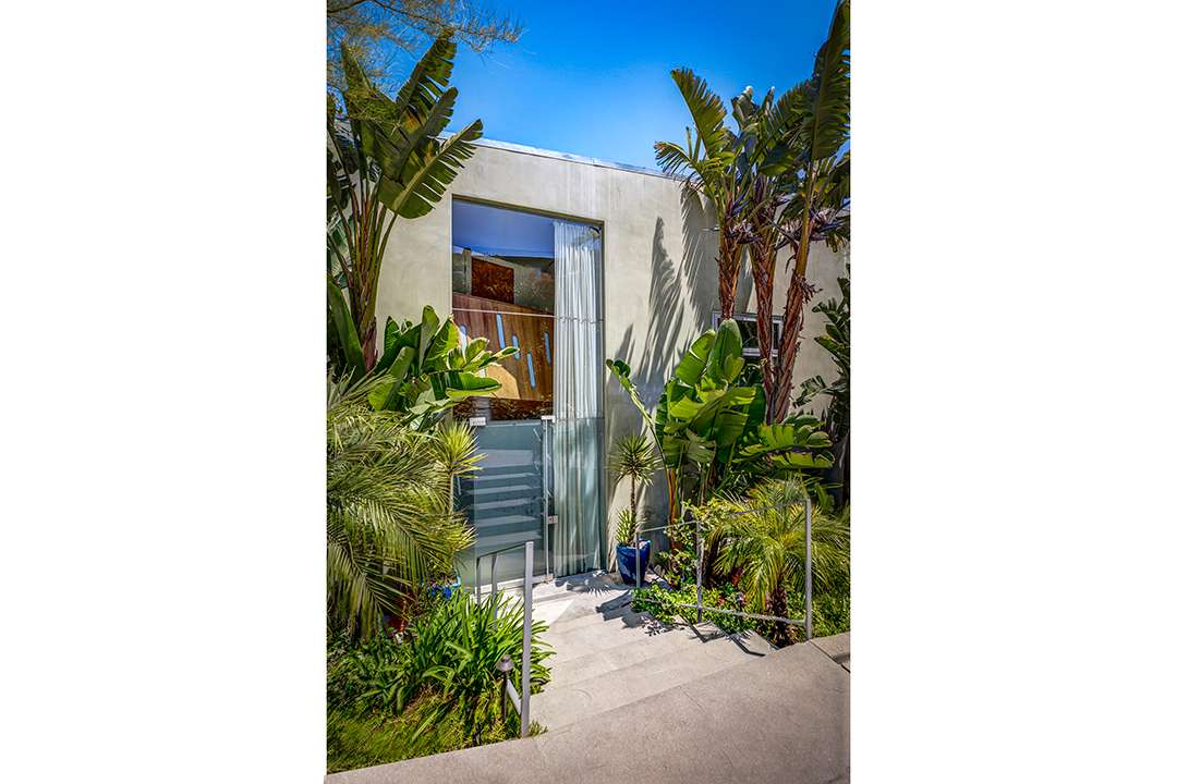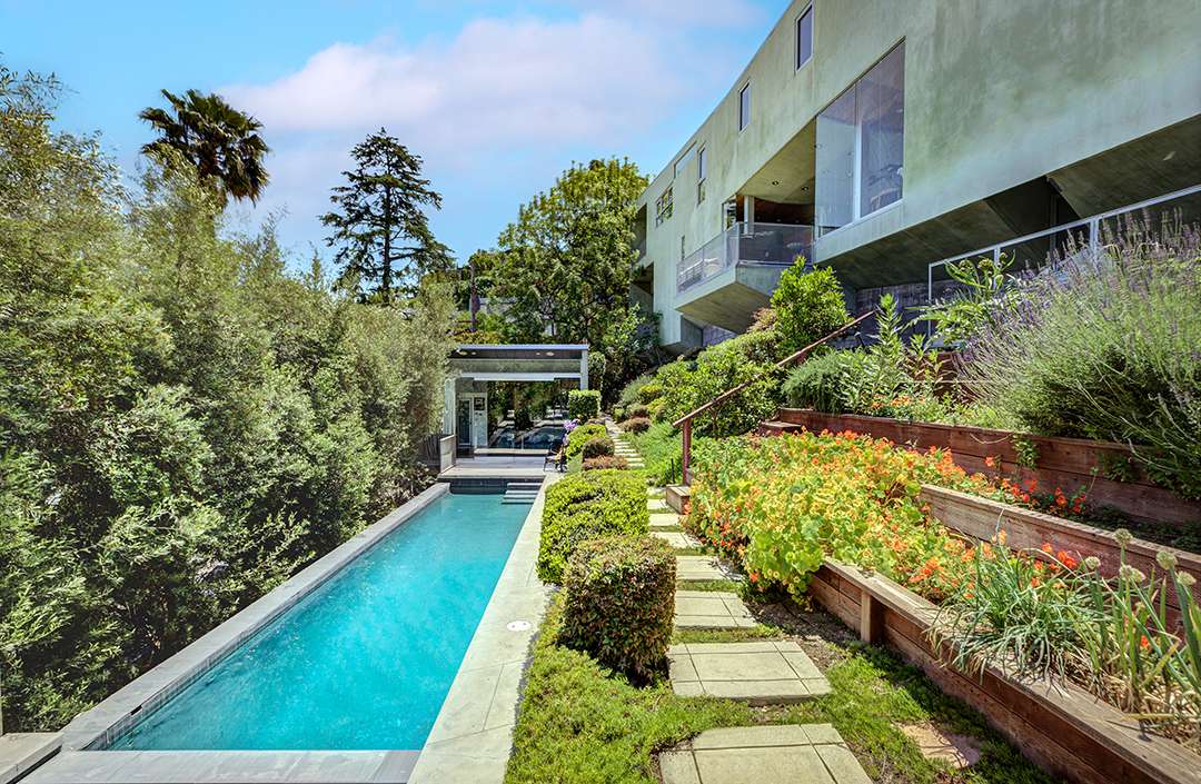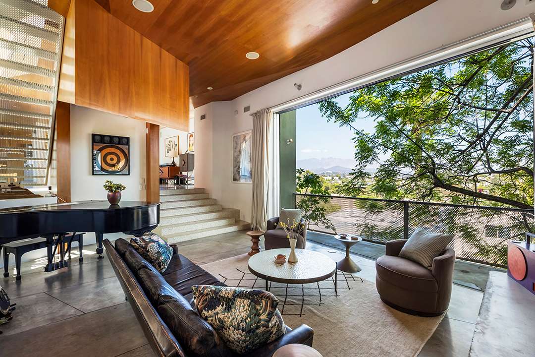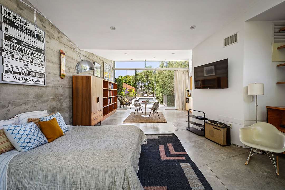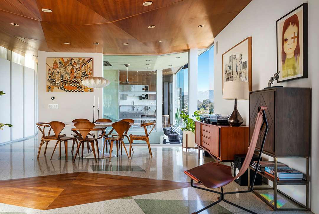 Built in 2007, the contemporary home with a concrete facade occupies a lush double lot overlooking L.A.’s green hills and valleys. Walls of glass grace every room, while geometric lines create interesting angles and unconventional shaped spaces. Cherry wood is also weaved throughout, emphasizing the art pieces that decorate the walls and fostering a tranquil, midcentury vibe.