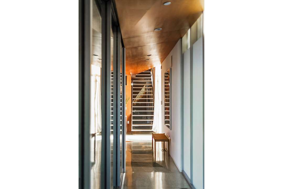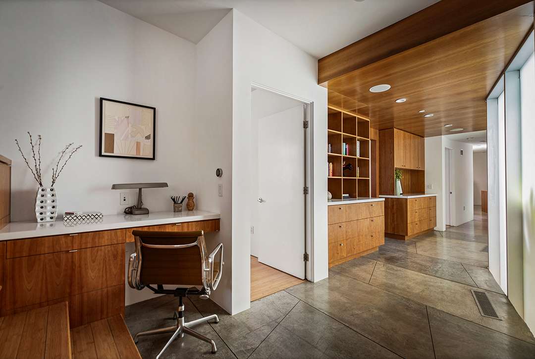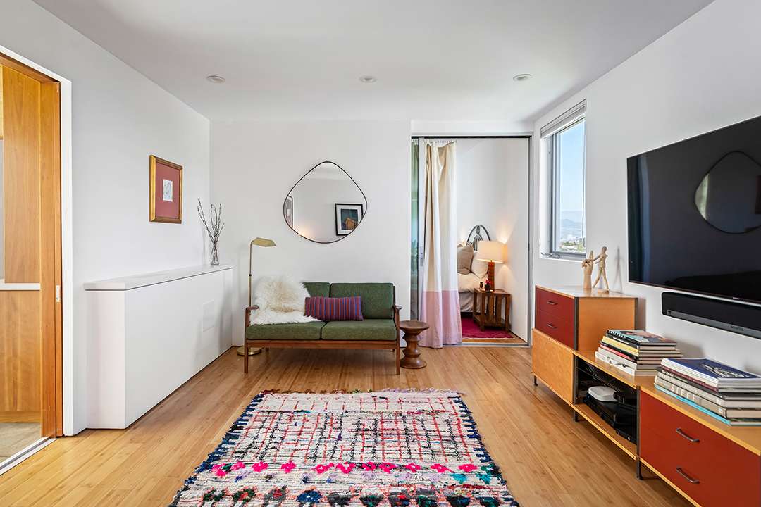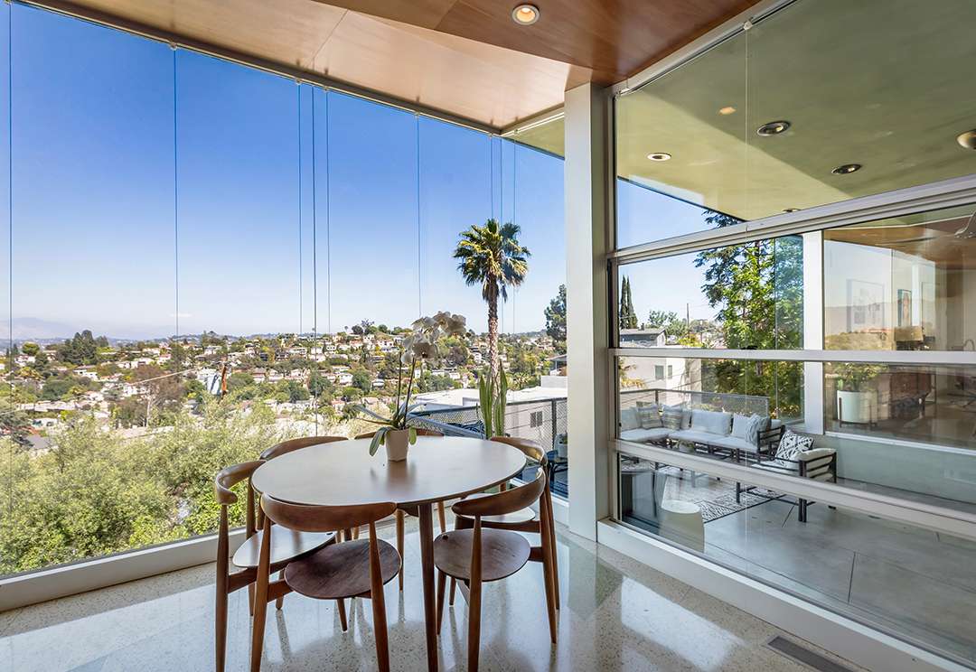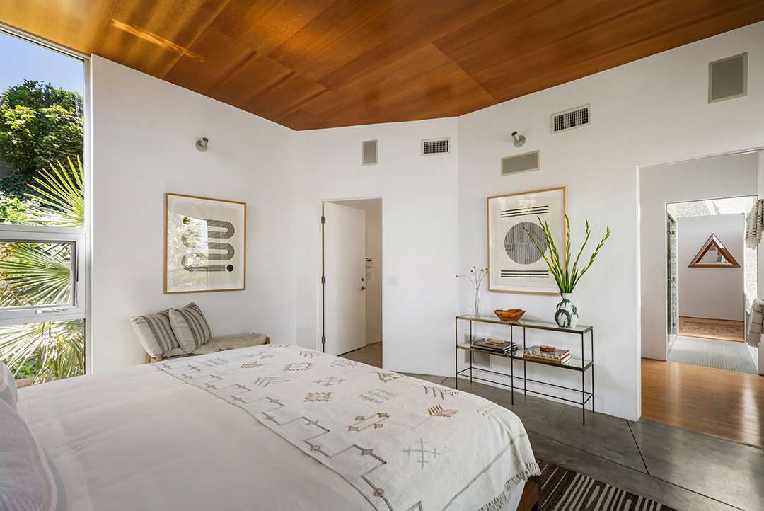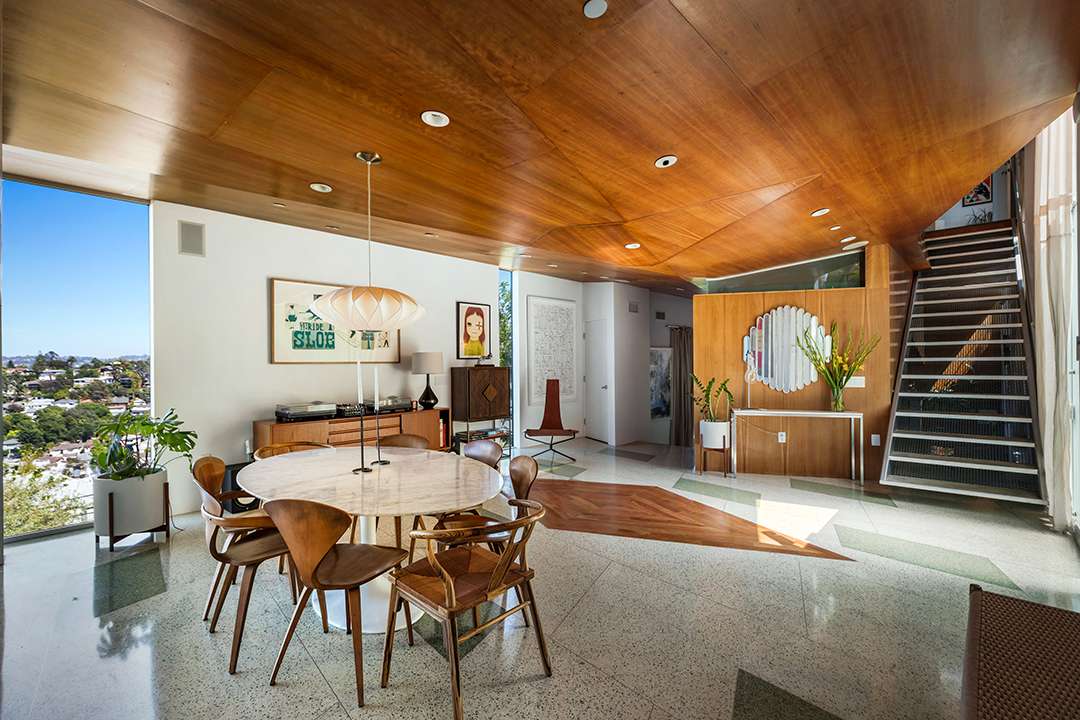 Built in 2007, the contemporary home with a concrete facade occupies a lush double lot overlooking L.A.’s green hills and valleys. Walls of glass grace every room, while geometric lines create interesting angles and unconventional shaped spaces. Cherry wood is also weaved throughout, emphasizing the art pieces that decorate the walls and fostering a tranquil, midcentury vibe.