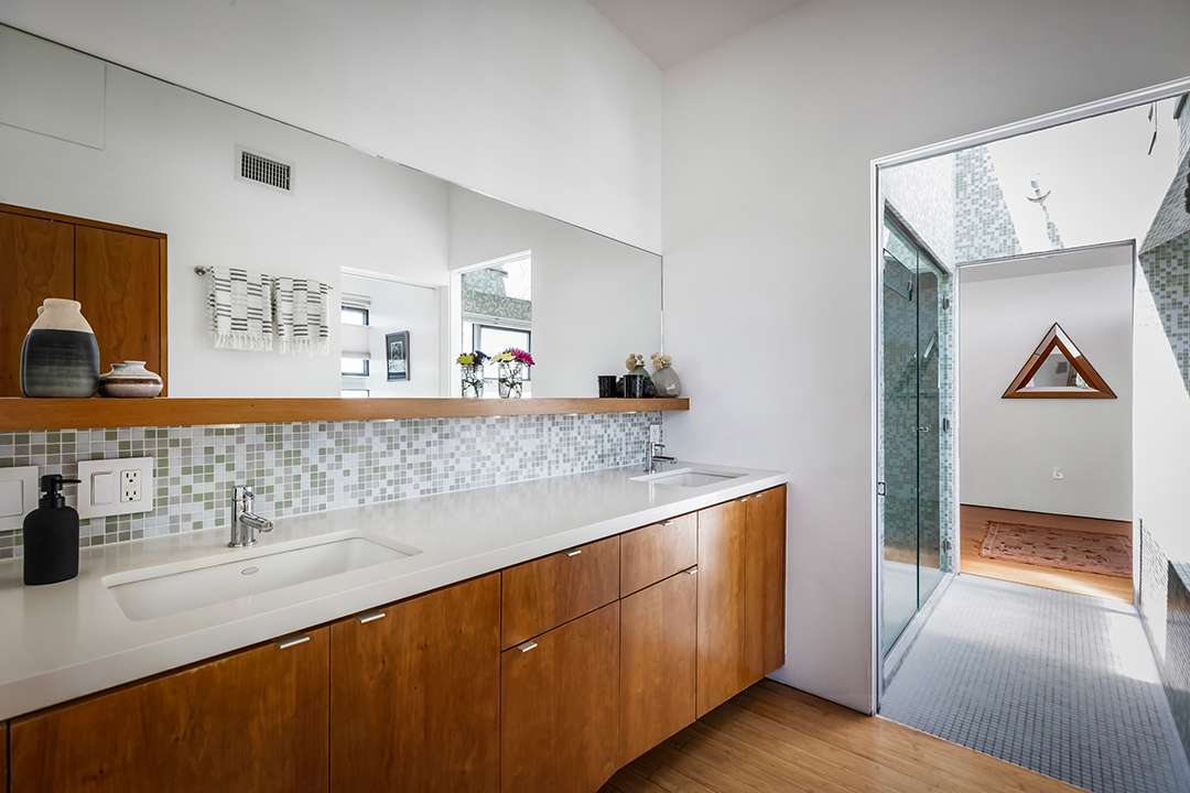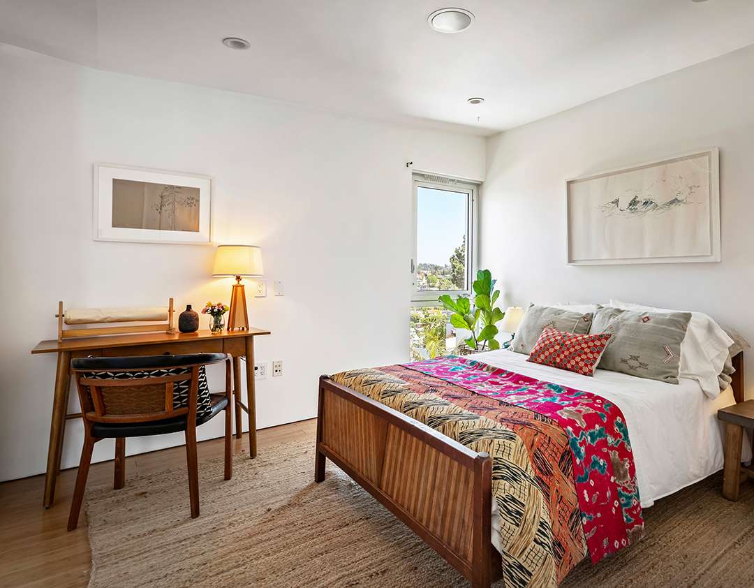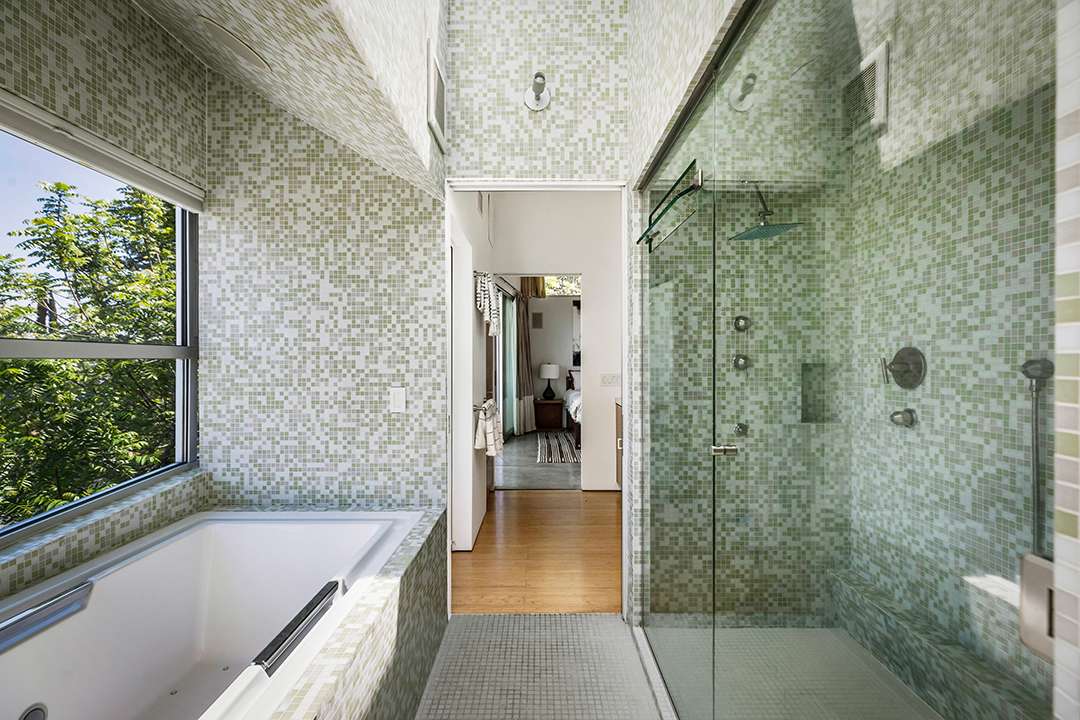 Spanning just over 4,000 square feet, the home is a great size and also spills out to patios and balconies in typical California style. The upper floor holds four bedrooms and four bathrooms, including a primary suite with a relaxing ensuite. Complete with a skylight, the bathroom is fully outfitted in green tiles and the same cherry wood seen on the main floor. Additionally on the property is a separate guest house, perfect for hosting overnight visitors or having a quiet creative studio.