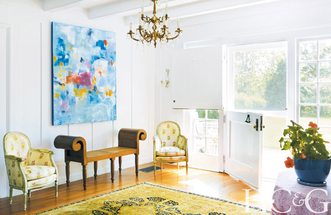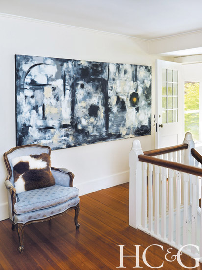 Designed in 1913 by J. Curtis Lawrence, the architect of the historic Ring Lardner residence nearby, the home now bears the couple’s stamp, its decor an accumulation of unusual finds and family heirlooms. A lacquer-topped table holding dozens of family photographs anchors the living room, where Breen’s abstract winter landscape The Gloaming hangs above the fireplace. The view through the entryway reveals various seating pieces with mix-and-match upholstery and pink mandevilla vines climbing the trellis on the back patio. At the vintage table in the dining room, which is typically set with one-off plates and glasses, guests often find newly created artwork at their seats—courtesy of one of the Breens’ children. And a sprinkling of estate-sale finds—including a collection of antique radios always tuned to NPR—adds further to the home’s cozy, bohemian energy. Breen and her husband call it the Hodgepodge Lodge. “This is a country house—we don’t try to make it anything but that,” says Breen, acknowledging the splattered paint that leads from the studio floor into the adjacent hallway.