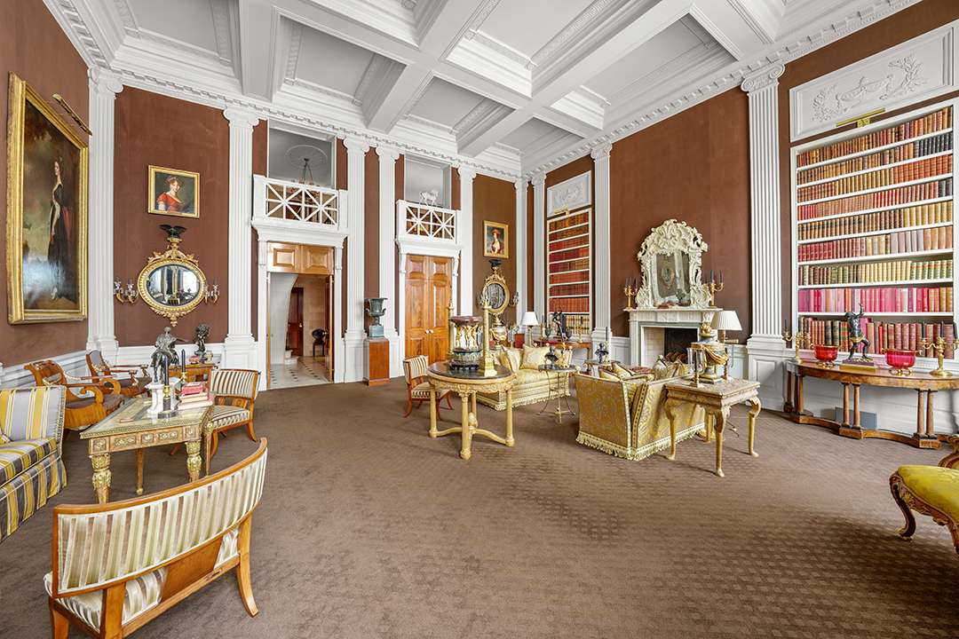 When it comes to Roehm’s special apartment, a semi-private elevator welcomes you to the enormous living room. Underneath the 18-foot ceilings, there are fluted pilasters with Corinthian capitals lining the room and deep brown wall panels in between. The ornate portrait paintings and built-in bookshelves suggest that whoever next calls this place home will need to be as erudite a collector as its current owner. Around the corner is the oval dining room, with pocket door that leads to the wet bar and comparably plain kitchen.