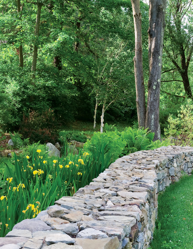 Seeing Red | A wall defines the edge of the stream where Jayne battles the invasive iris.