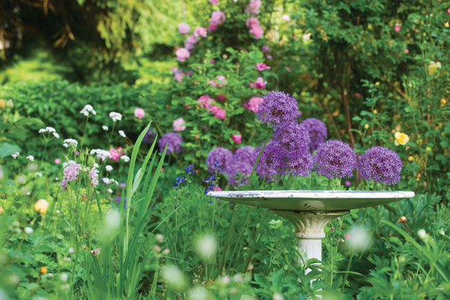 Allium Levitation | The tall Globemaster alliums appear to be floating above Jayne’s antique birdbath beside the house.