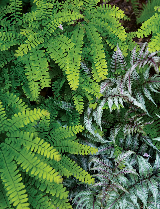Seeing Red | Maidenhair and painted ferns touch shoulders.