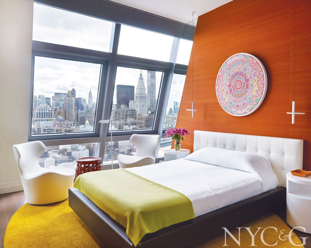 A Millard Owen Sheets painting and a velvet-upholstered bench face the bed, along with midtown Manhattan views.