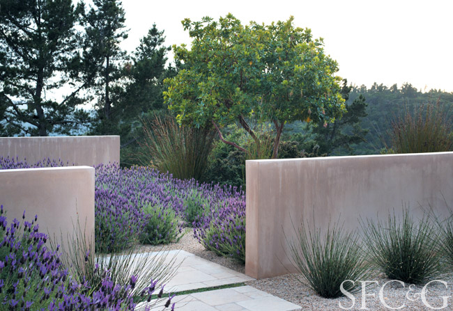 Profoundly respectful of existing plant life, and true to his reputation for creating subtle, almost imperceivable boundaries between the cultivated and wild, he preserved the native landscape while bringing in nearly 5,000 plants—predominantly Californian and Mediterranean-climate species—to enhance the 11-acre property. He noted, for example, that the west side of the house, a corner that gets south and west sun, “could make a powerful, distinct visual moment.” Leaving in place an existing Arbutus “Marina” of the Madrone family, which, with its distinctive orange bark and inherent resilience, makes it a stunning dry-garden tree, Trainor surrounded it with a lush plot of vivid Spanish lavender, a longer-flowering breed that blooms on and off over a 12-month period. The juxtaposition of three minimalist plinths with the bursts of purple blooms creates a dynamic moment that is the focal point for the courtyard.