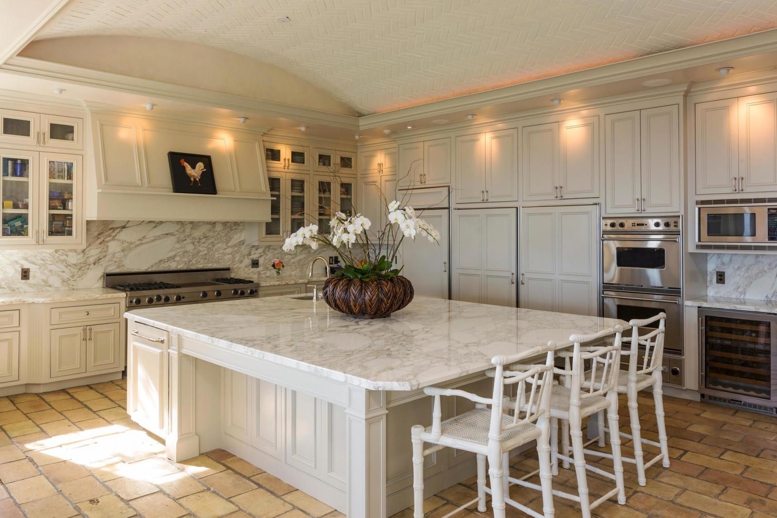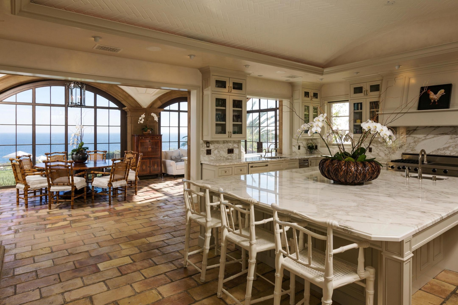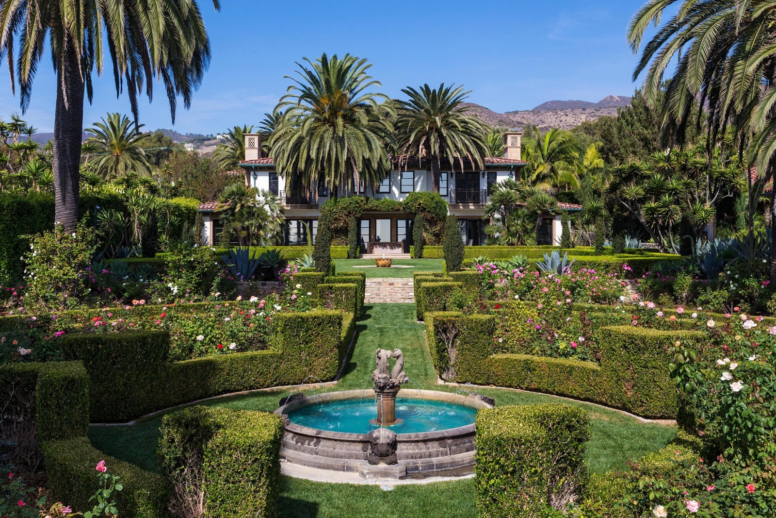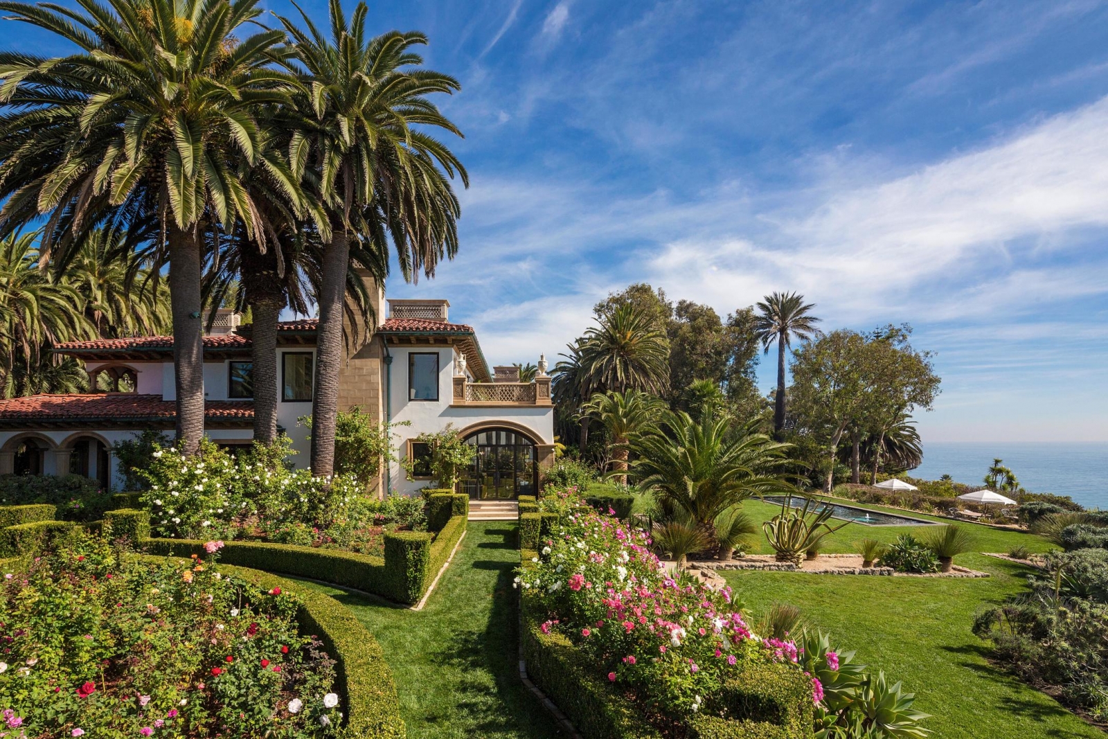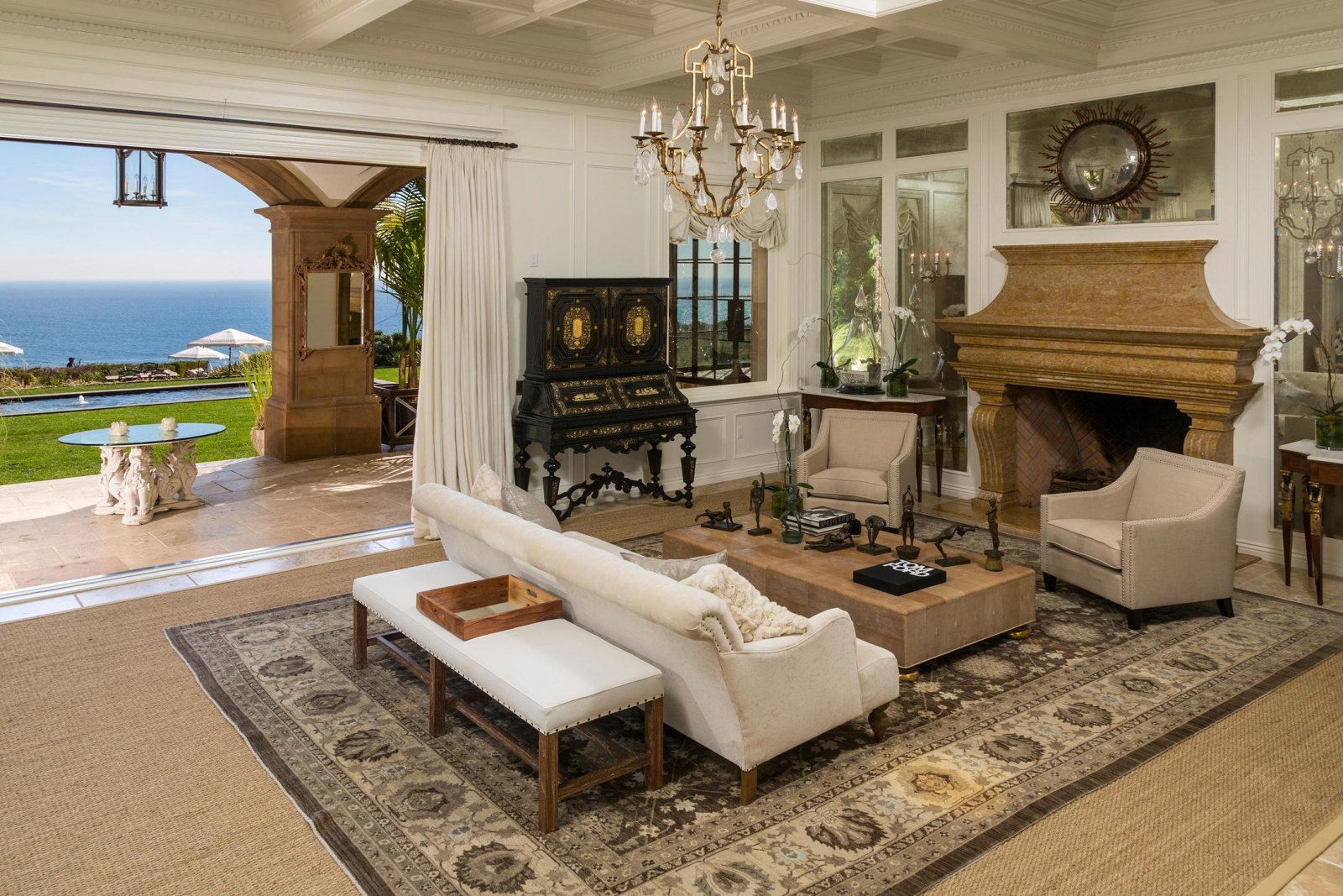 The compound is comprised of a main villa, extravagant guesthouse, separate office structure and an ornate indoor pool ballroom, all sited behind gates on a private estate with unobstructed views of the Pacific Ocean. Every inch of the home is dripping with luxury, from the 2,500-year-old lion’s head sculpture found at the base of Mount Vesuvius that surveys the entry, to the Hermès marble fireplace in the library, to the hand-carved French limestone ceiling in the 24-person dining room. The main house additionally features a billiards room, wine cellar, screening room, gym and elevator. The grounds feature a saltwater infinity pool and full outdoor kitchen as well as the pool pavilion, which is fully outfitted in baroque style with onyx-lined changing rooms and a luxurious indoor pool.