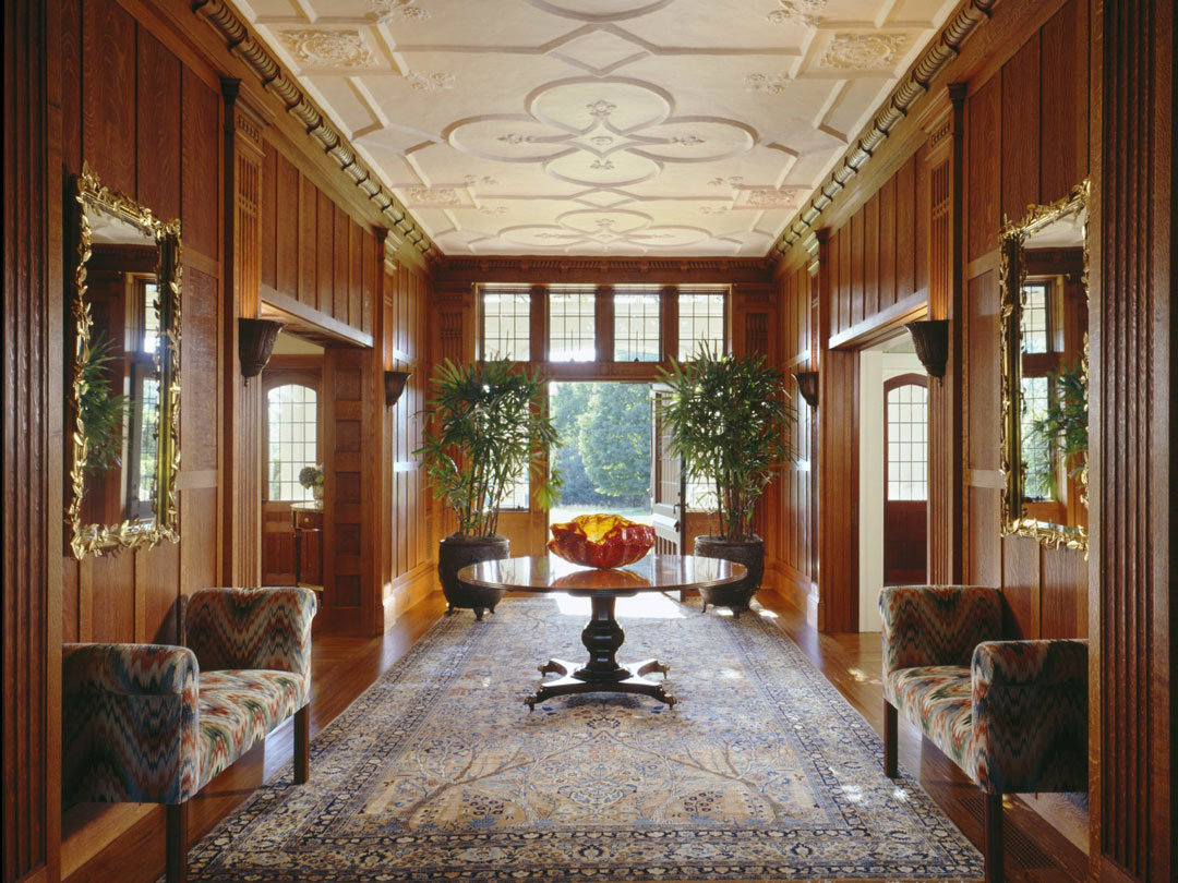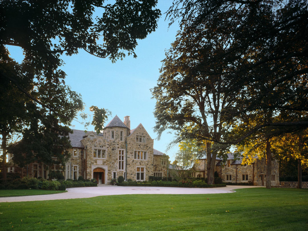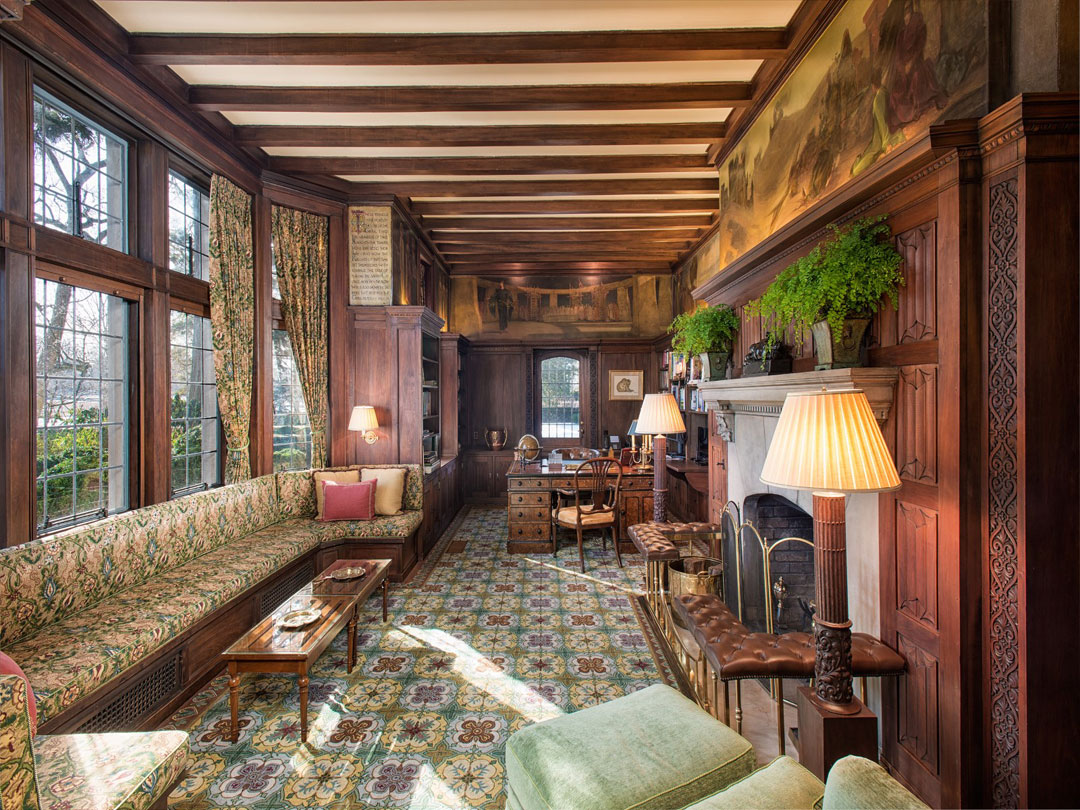 Originally built by New York architects Hunt & Hunt for publishing magnate H.J. Fisher, the estate was bought by billionaire investor Stanley Druckenmiller in 2004 and underwent an extensive restoration and renovation that succeeded in retaining museum-quality appointments like the English oak paneling and original fireplaces, while introducing new imported wall coverings, carpets and draperies curated by Pamela Banker Associates. The 12,238-square-foot fieldstone manor includes 8 bedrooms and 12 bathrooms along with grand entertaining spaces and a contemporary family wing that features the Poggenpohl-appointed kitchen, family room and home gymnasium. A recent addition by Austin Patterson Disston Architects added a 2-bedroom guest apartment and 4-car garage. Sotheby’s International Realty’s Leslie McElwreath represents the listing, which was reported on Mansion Global.