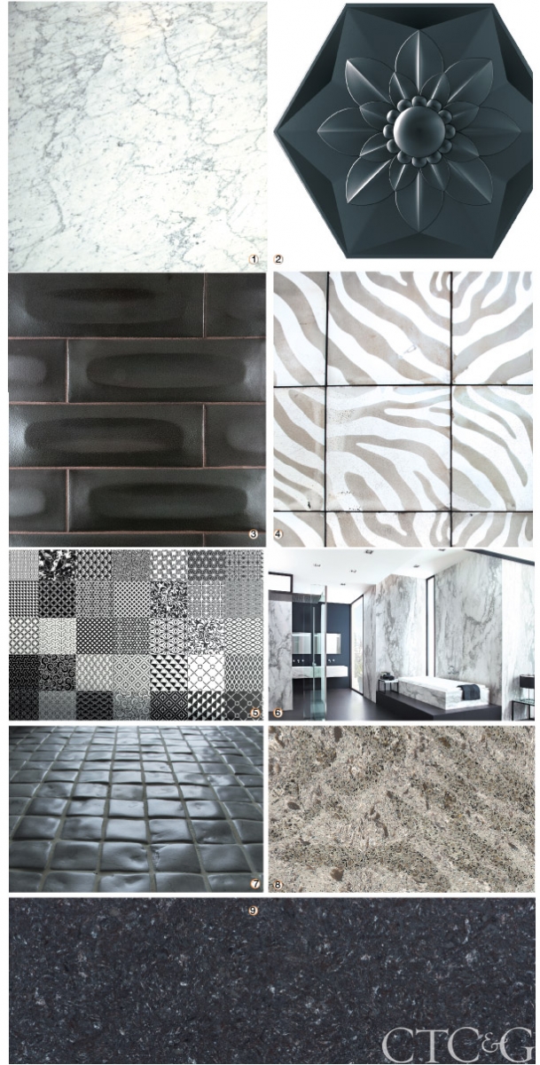 2. Bisazza’s first ceramic collection is Frozen Garden by Marcel Wanders. Frozen Crystal and Frozen Flower (shown) hexagonal black and white tiles are available in diamond and flower shapes, transforming walls into a tactile fabric. Bisazza, NYC, 212-334-7130.