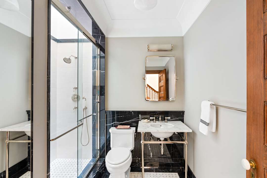 The five-bedroom home itself has much to admire as well. It boasts a landscaped and gated forecourt and an at-grade entry instead of the typical stoop. Original tile work, period moldings, and decorative fireplaces remain, while tasteful updates like restored hardwood floors, new decking, and upgraded appliances bring the residence into the 21st century.