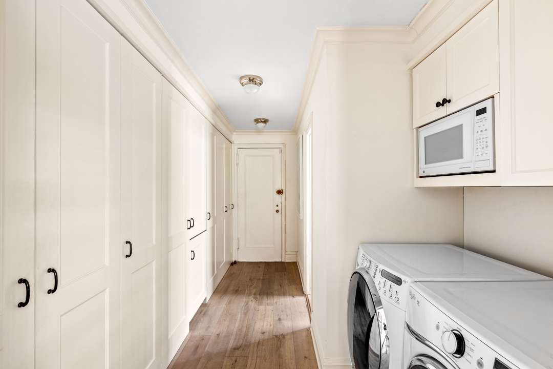 Design details include herringbone oak floors, tall ceilings, a two-sided decorative fireplace, French doors, and large windows. The apartment is equipped with a spacious kitchen and separate bar space, ideal for hosting upscale soirées.