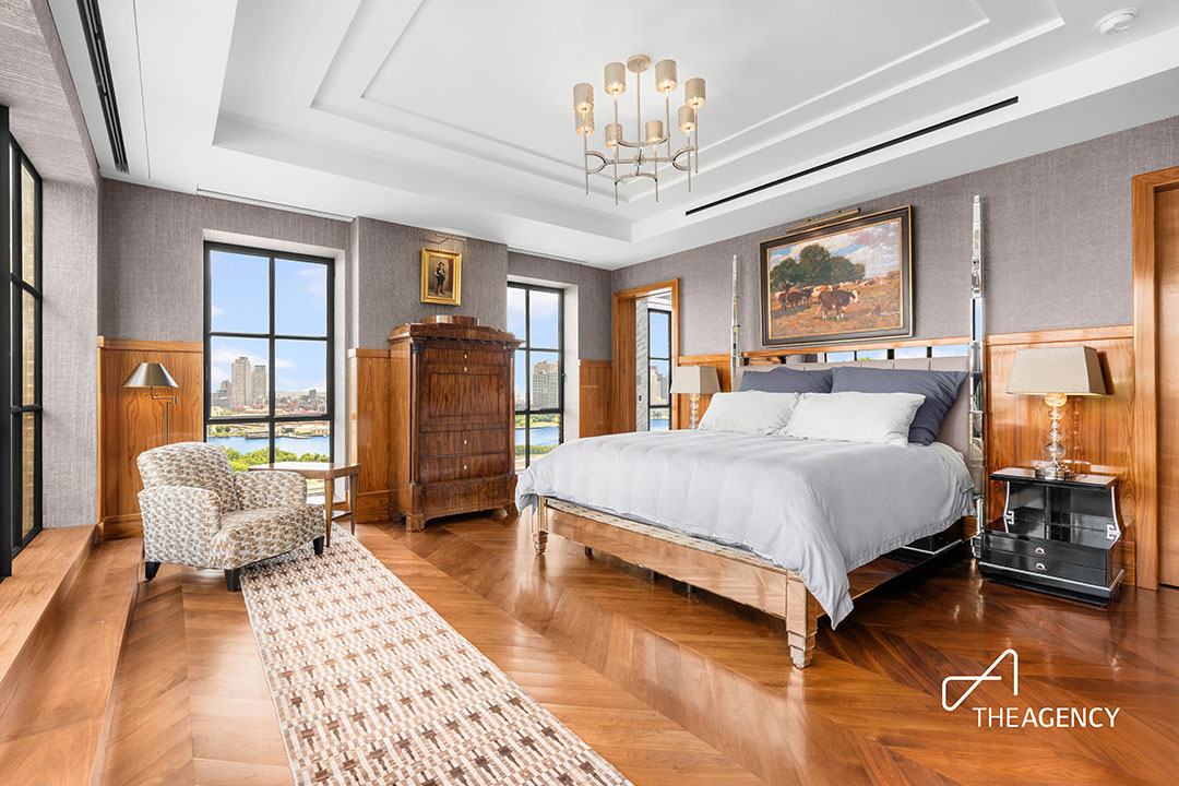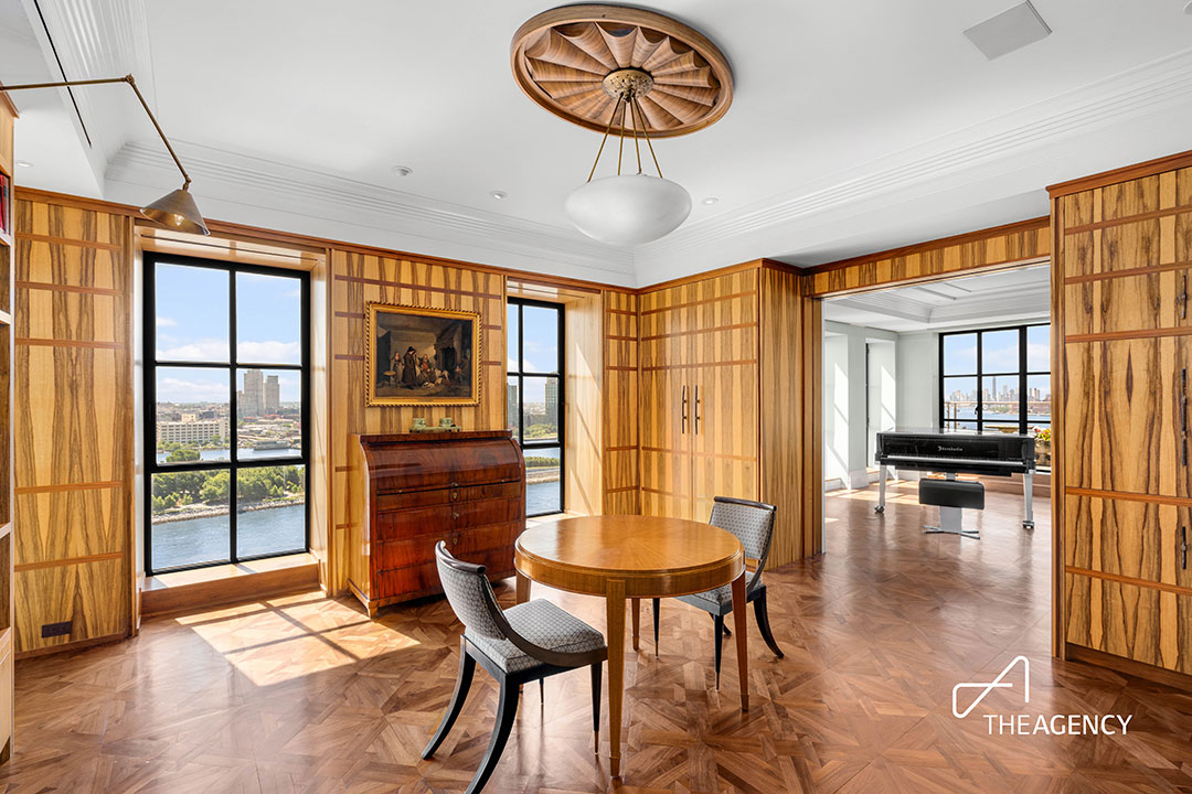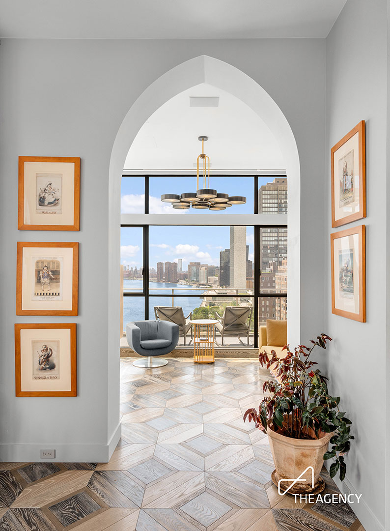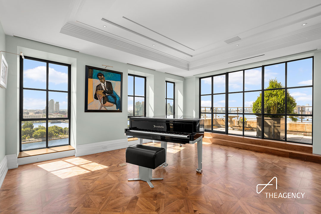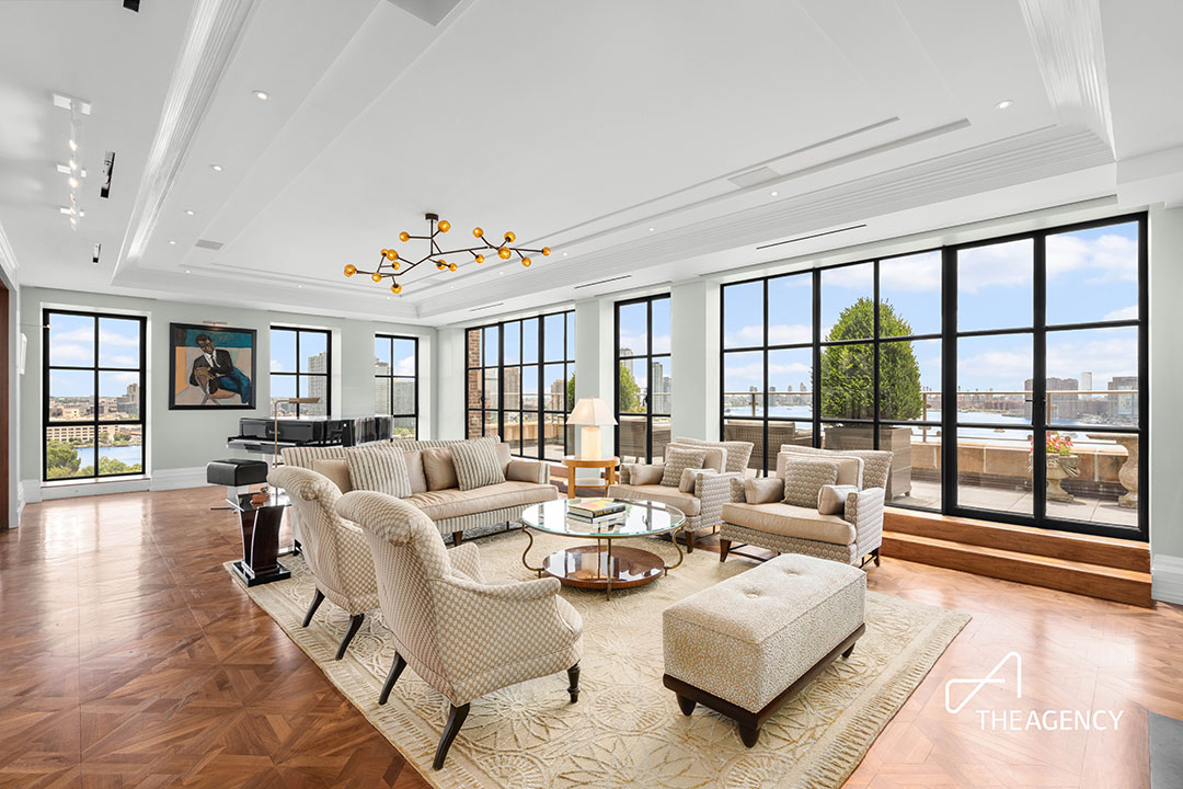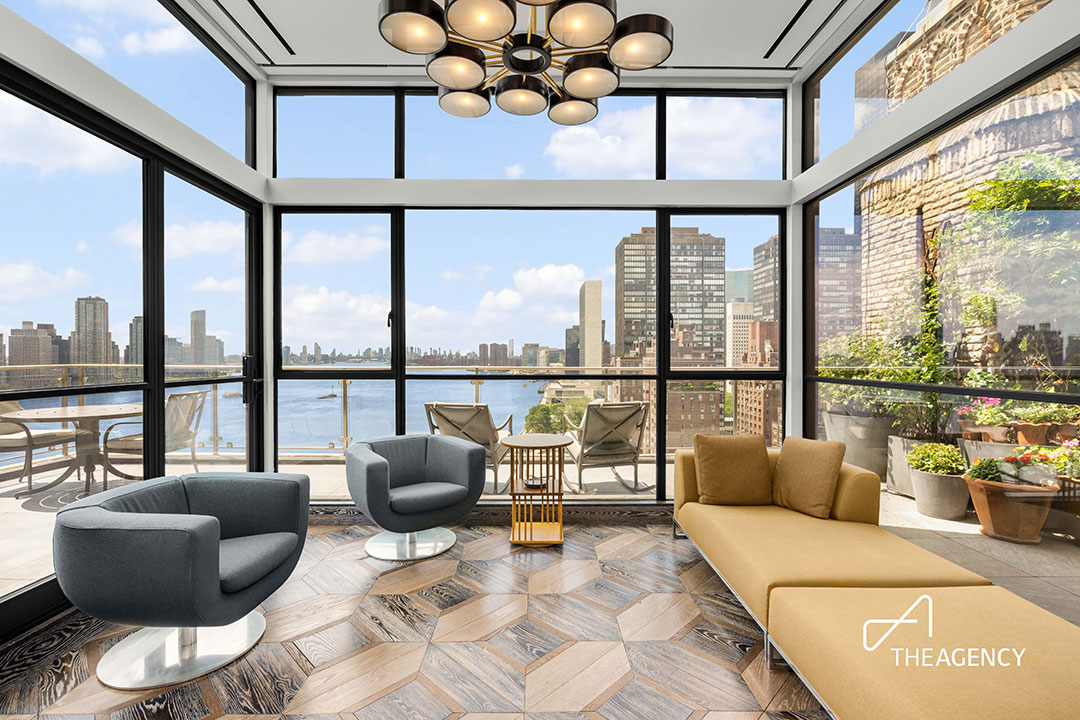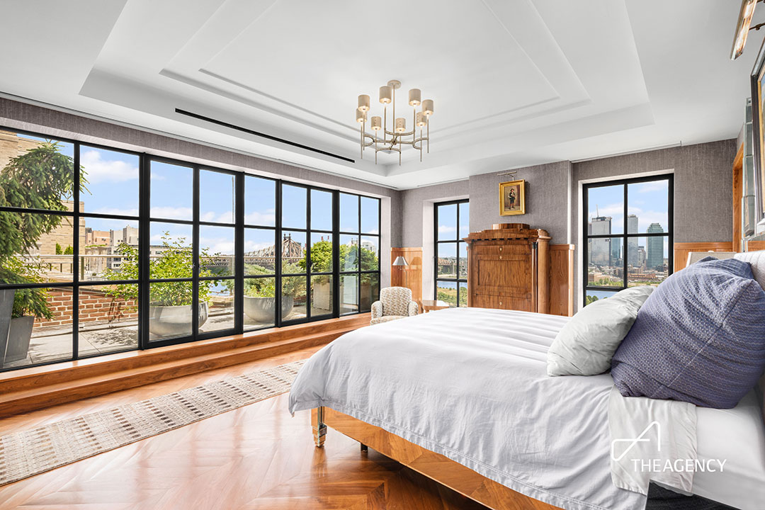 Other notable features include an elevator that opens directly into the home, a glass sunroom, walk-in closets, and 11-foot ceilings. “Because of the way Manhattan is shaped and the height of the apartment, it feels like it is in the middle of the river with no surrounding buildings,” says listing agent Tyler Whitman of The Agency, who once had a role on screen as well.
