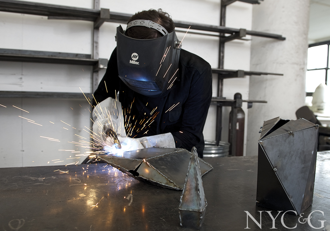 South Bronx–based artisan Jake Szymanski doesn’t call himself a metalworker—even though he has made his name crafting avant-garde blackened-steel furniture, lighting, and objets d’art. “I consider my designs sculpted,” explains Szymanski, decked out in an all-black ensemble that matches his monochromatic pieces. “I start with more material than necessary and grind it down to create its form, as you would with clay or stone.”