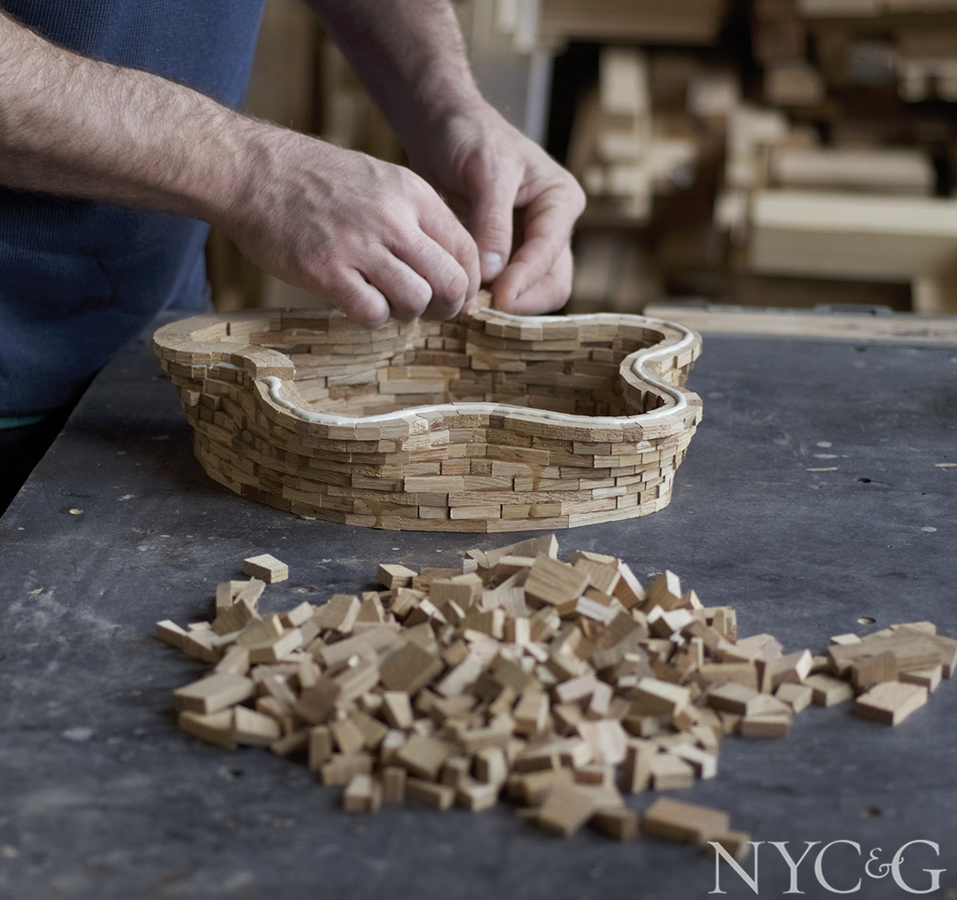 In Haining’s 350-square-foot studio, piles of wood—ranging from walnut and maple to Alaskan cedar and California redwood—line the walls, alongside life-size sketches of in-progress products that he uses for reference as he works. To begin a vessel, he selects a wood species and cuts up a handful of boards into tiny chunks. He bonds five veneer discs together to form the base, and then arranges a ring of wooden pieces around the perimeter, proceeding to stack them and coating each layer with glue (a small vessel typically comprises 1,000 pieces, with 25 per ring).