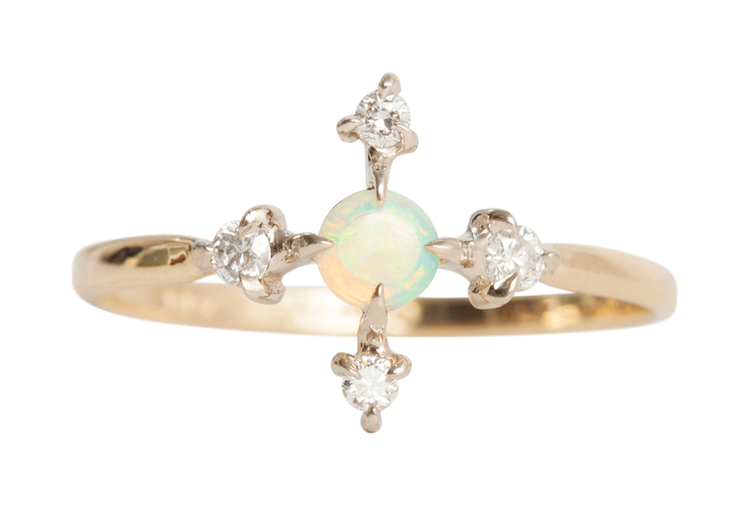 Catbird’s handmade Moon Flower ring with opals and diamonds in 14k white and yellow gold, $594, 219 Bedford Ave., Brooklyn, 718-599-2340, catbirdnyc.com.