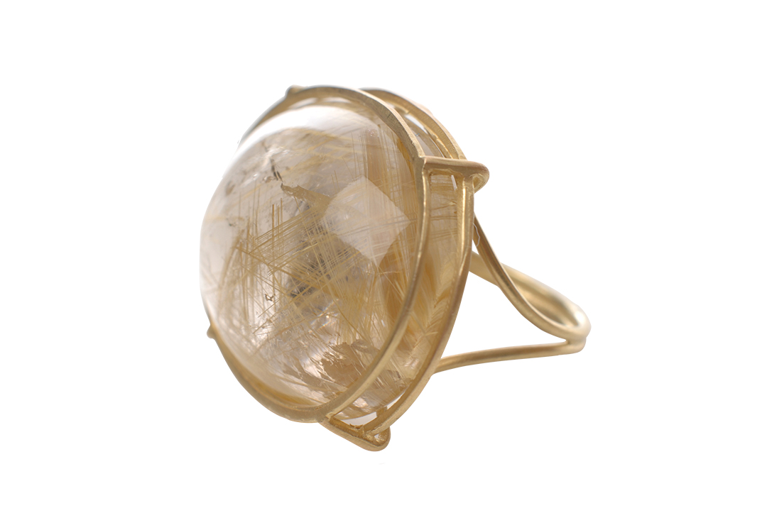Rutilated quartz Cage ring in 18k yellow gold by Rosanne Pugliese, $1,540, 307 Henry St., Brooklyn, 718-624-6546, rosannepugliese.com; also available at Peridot, 1903 Palmer Ave., Larchmont, 914-833-7333, peridotfinejewelry.com.