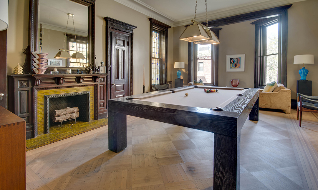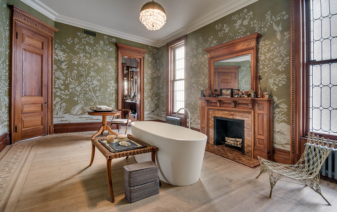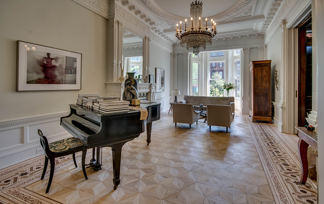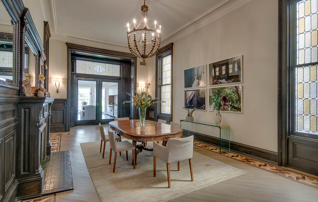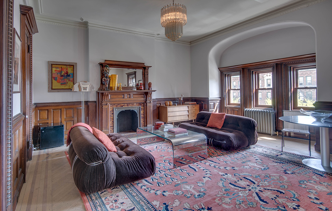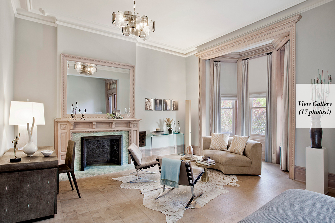 Dubbed the Pfizer mansion, this 25-foot-wide Queen Anne–style townhouse in Clinton Hill was built in 1887 by German chemist and Pfizer pharmaceuticals co-founder Charles Erhart as a gift for his daughter. The five-story 10,000-square foot residence, currently listed for $13.5 million with Angela Ferrante of Brown Harris Stevens, once housed the temporary offices of the Brooklyn Public Library and, later, the private quarters of a Roman Catholic bishop.Musician Legion Davies purchased the seven-bedroom home—which features eight fireplaces, stained-glass windows, multiple skylights, a wine cellar, front and rear gardens, and parking—in 1991 for an undisclosed sum. When the current owners bought the mansion from Davies in 2007 for $3.2 million, they embarked on an extensive renovation, preserving the vintage Otis elevator, inlaid wood flooring, and intricate plaster moldings. “It has been meticulously restored,” Ferrante says, “to provide modern comforts while honoring its history.”