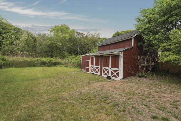 The grounds feature a charming red barn.