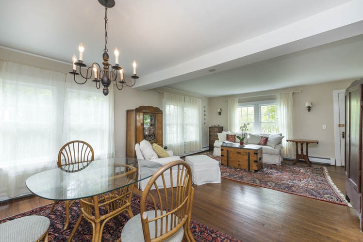 The living and dining areas are filled with light.