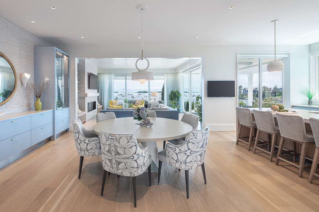 When it came to the interiors, the homeowners asked for a clean and modern yet timeless aesthetic that emphasized their treasured views. Cardello Architects, Havilande Whitcomb Design, and Downsview Kitchens leaned into a soft, neutral palette with balanced splashes of blue and green throughout. Ample glass, high ceilings, and light-toned wood further accentuate a coastal, airy feel.