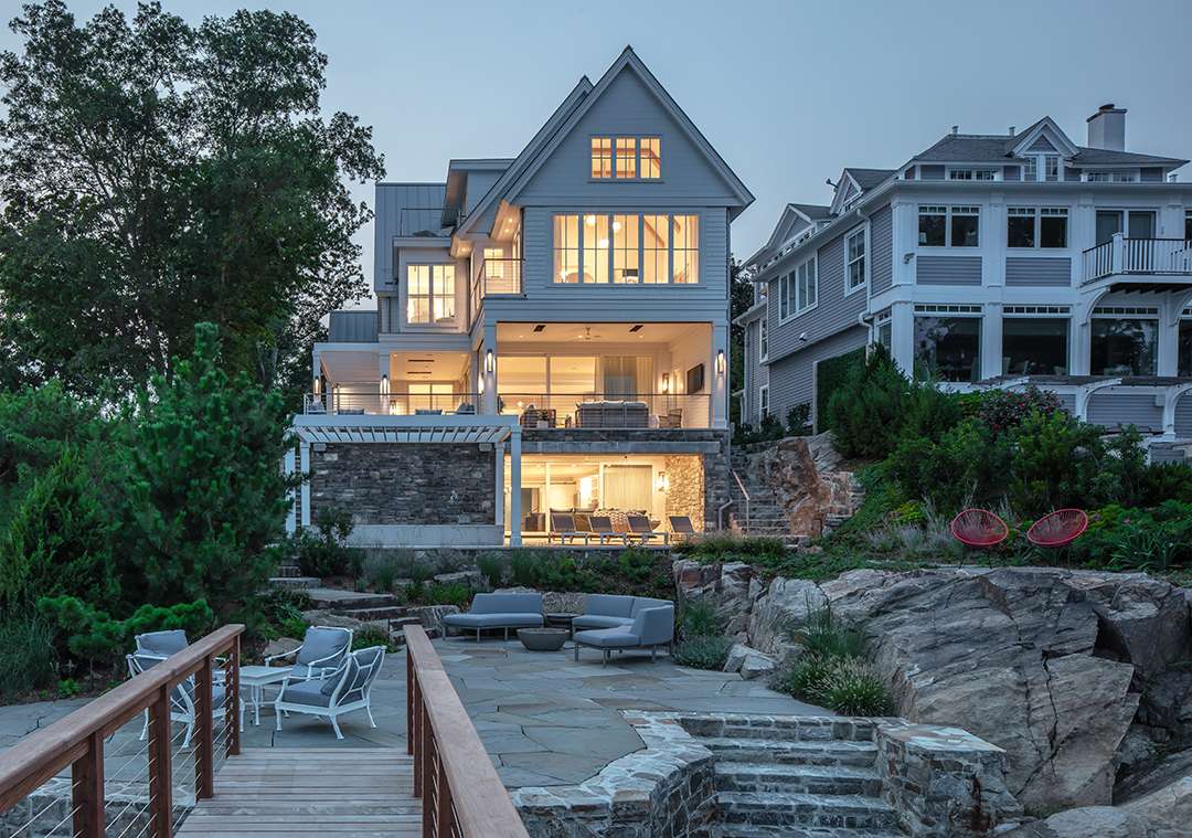 At this picturesque Connecticut property, the new homeowners were especially excited about the process of framing the water and island views. That lead to rethinking the primary suite and pulling it out further to give the couple the exact vantage point they craved. Another key shift? The original clients hadn’t wanted a basement, but the new clients did. Cardello Architects added in a basement level with gorgeous living spaces for them, which required hammering out an additional 10 feet of rock.