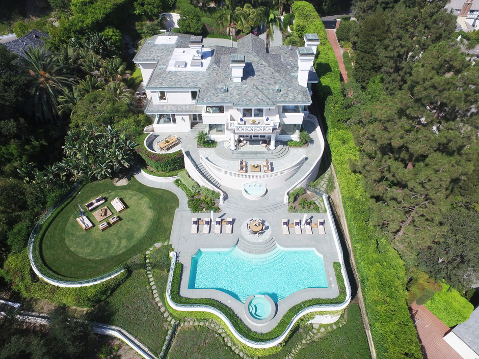 Part of the exclusive “Platinum Triangle” neighborhoods in Los Angeles, the house is located in a tony enclave known as Lower Perugia Way and is one of only a dozen homes to border the Bel Air Country Club. A grand double staircase greets guests in the entry, which leads to the main level living spaces that overlook the golf course. Upstairs, there are 2 guest suites as well as the sprawling master and multiple private terraces and balconies that overlook the property. Additional luxe features include a media room, fitness room, putting green and swimming pool with waterfalls.