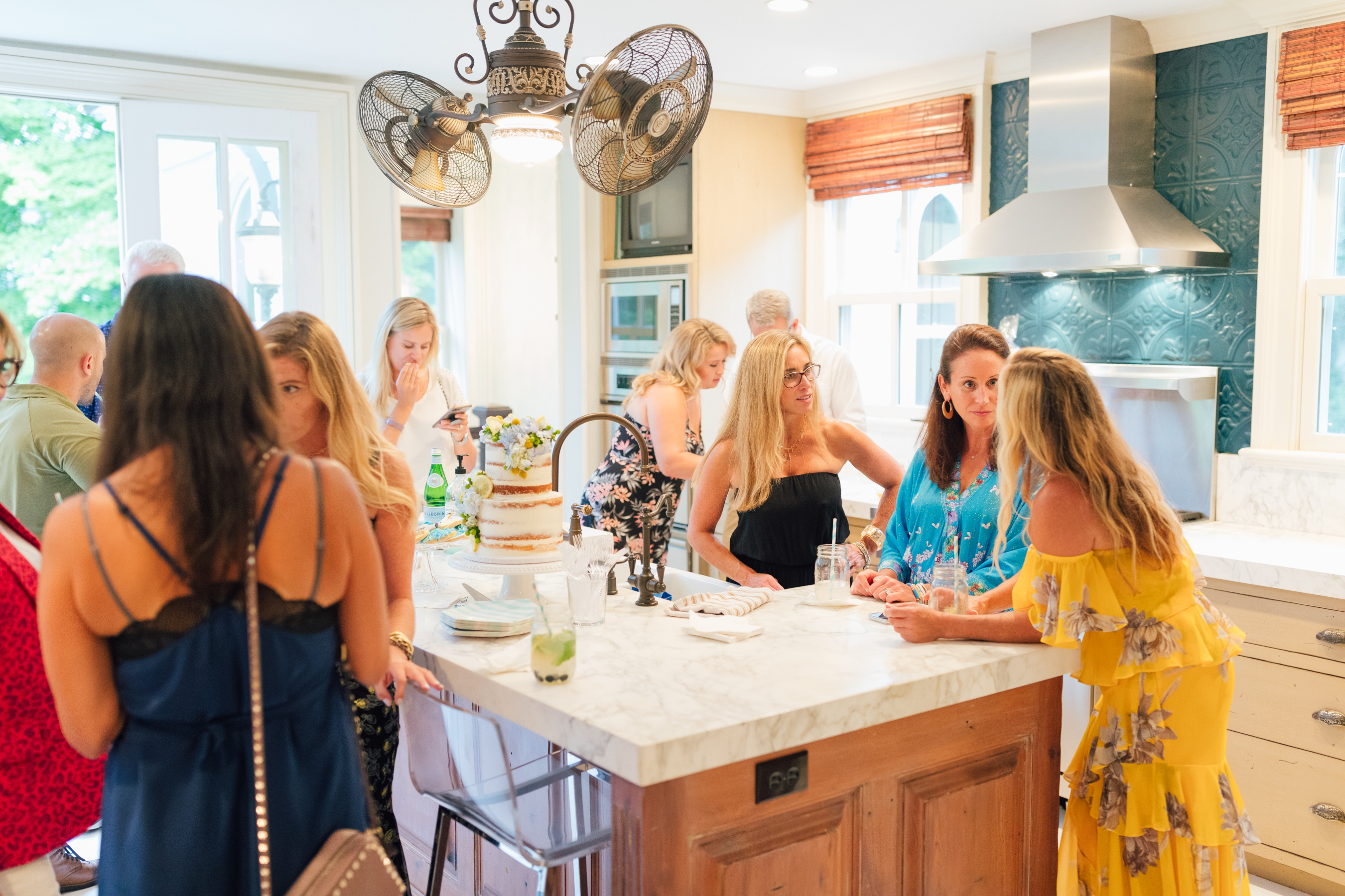 Covering 5,699-square-feet and set on a lush 1.6-acre lawn, the HOBI award-winning property was the perfect place to host a summer get-together. Between rain showers, we enjoyed sips of a Cylinder Vodka blueberry lemonade and Bimble Bev sparkling water on the expansive patio and deck, outfitted in blue and white in true Connecticut fashion. From the TipSea Trailer bar on the lawn, we were able to take in the details of the home’s exterior, and views of the gated, in-ground pool surrounded by beautiful hydrangeas. Nielsen’s provided stunning flower arrangements to decorate each space. The asking price for this home is $3.175 million.