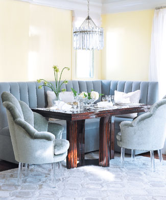 Luxurious notes characterize virtually every accessory, from fox fur pillows to a Holland & Sherry embroidered cashmere throw to snakeskin boxes and picture frames by New York–based designer Robyn Brooks. Shagreen finishes from Etched Design in New York cover custom furniture, and Lucite legs on armchairs lighten up a more stolid channel-backed banquette in the dining area. The master bedroom’s ceiling is even covered in tiny crystal balls that give off a luminous glow, while custom reverse-painted glass and silver-leaf closet doors reflect the windows across the room, creating a sense of dreamy light.