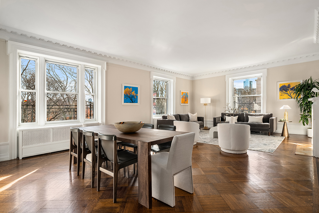 Upon stepping over the threshold of the spacious residence, guests are privy to over 50 feet of Central Park’s expansive lawns. Rich history is highlighted through the unit’s details, including original moldings and oak floors. While teeming with elements of the past, it is easy to spot the pristine updates made for the modern homeowner. Three bedrooms and three full bathrooms offer more than enough space for multiple occupants. There’s also a living room with oversized windows, a formal dining area, and a library that has the potential to convert into a fourth bedroom. The master bedroom rests in the corner of the apartment, receiving southern and western exposure.