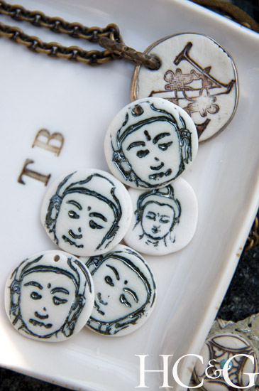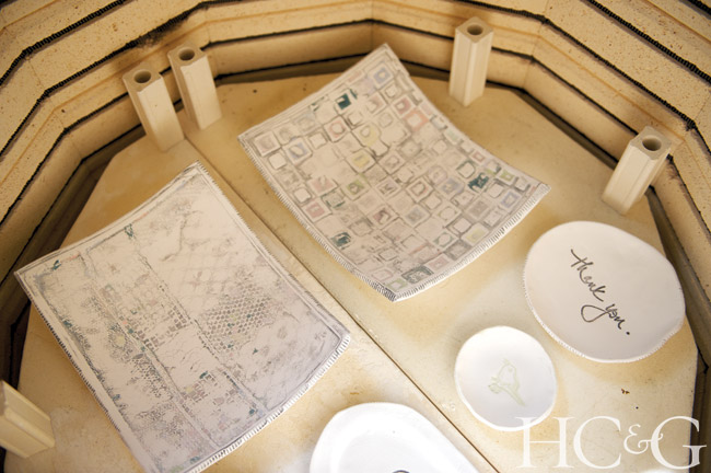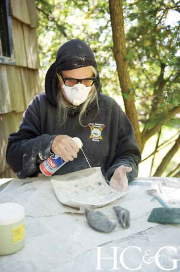 Next, Mougin makes an imprint onto the wet clay, using a hand-made resin or polymer mold, stamp, or other object, such as a pair of doll’s glasses or an Italian Milagros. Draping the wet clay over the mold to create the contour, she places a sheath of plastic wrap between the porcelain and a shaping object, which might be a bowl or an egg carton or something Mougin has carved by hand. Once the clay begins to harden, she stuffs paper towels between it and the object until it dries, then colors in the design with a variety of stains. Finally, Mougin strips off her jewelry and suits up—covered from head to toe with protective clothing and a dust mask—to sand the piece smooth, using either sandpaper or steel wool.