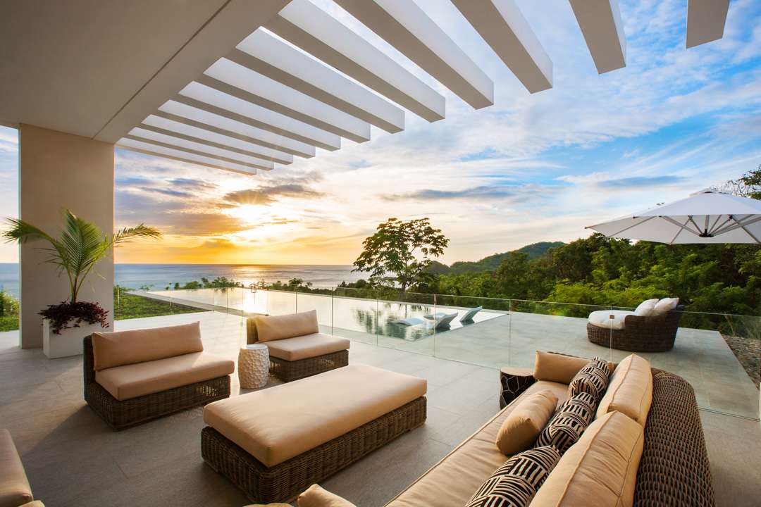 The decked-out compound is on the country’s western coast, overlooking the Pacific Ocean. In particular, the six-bedroom main house, called La Florcita, is perched 130-feet above the ocean. Indoor/outdoor living allows for soaking up the panoramic views and taking in the surrounding nature. There are sliding glass doors, terraces, outdoor lounges, and an infinity pool.