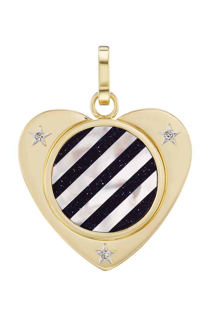 Anna Maccieri Rossi’s 18k yellow-gold heart charm with mother of pearl and aventurine-glass striped center, with white gold and diamond star details, $5,940.