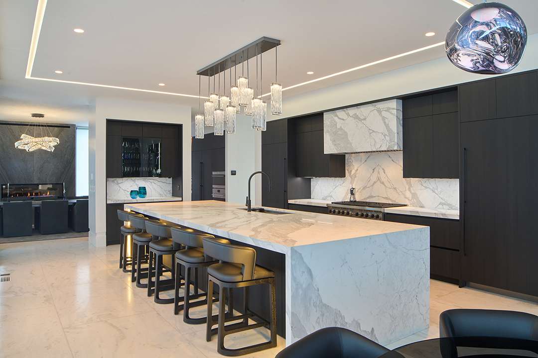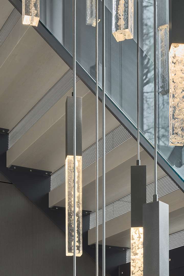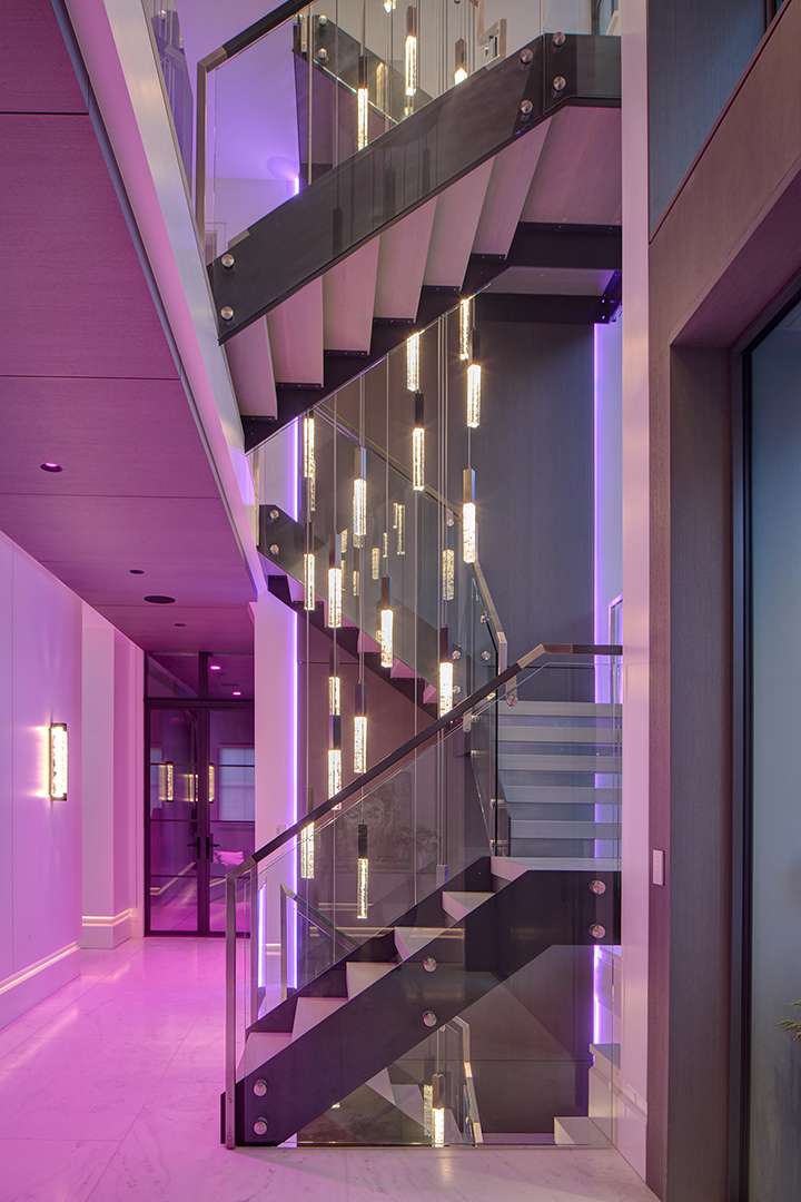 The large expanses of glass and neutral color palette purposefully let natural light dominate the look and feel of the home during the day. Sunshine streams across the high-end stone choices, illuminates the chic living areas, and dances through the raindrop-like chandeliers, one of which cascades down the sculptural staircase spanning three levels.