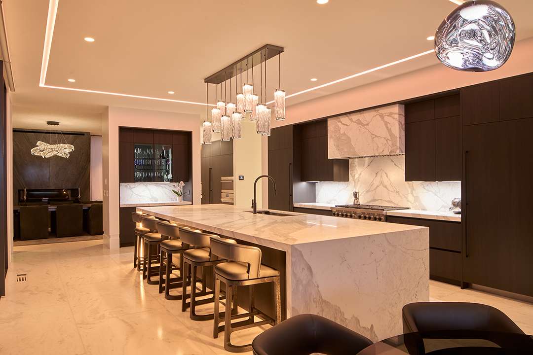 These hidden lights, weaved throughout the interiors, are always there to add a hint of glamour and warm ambiance on casual nights at home, too. The client muses, “If I had known how much I would enjoy the dynamic lighting design, I would have added even more of it to the project, including more of the baseboard lighting.”