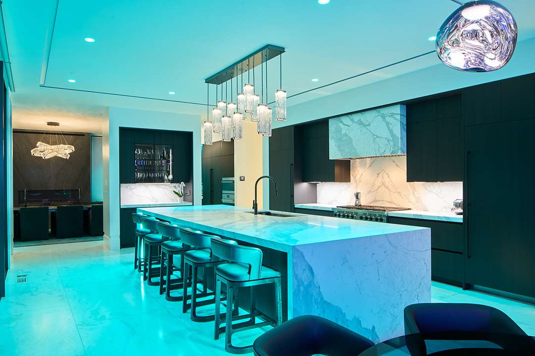 Of course, any time the homeowners want to override these settings, they can make the lighting as bright, dim, warm, cool, or colorful as they want. This especially comes in handy during hockey season. The couple are huge Rangers fans and love to host game day gatherings. Thanks to the inset lights tucked into custom baseboards and ceilings, they can envelop the rooms in red and blue to get all their guests into the spirit. More colors are also available to set the mood when celebrating holidays or entertaining year-round.