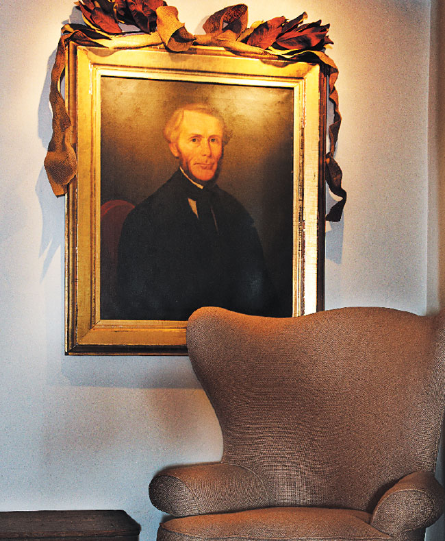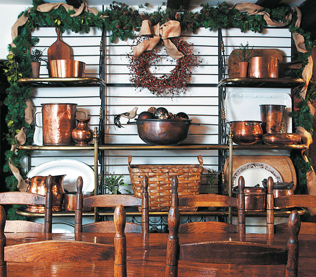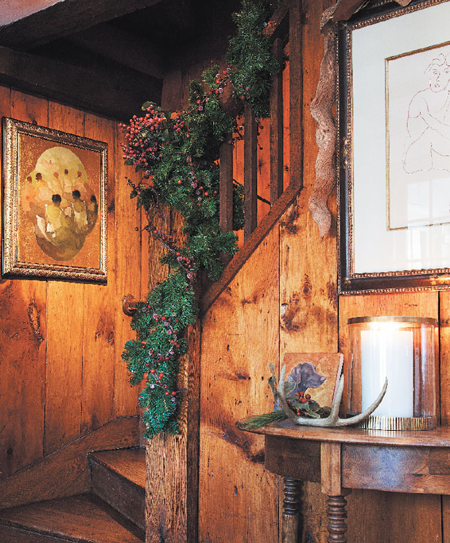 Warm Welcome | The original fieldstone fireplace, its imposing antique mantel adorned with an array of candles and greens, is the focal point of the cozy living room. Plush plaid pillows and toasty throws invite lounging in front of the fire.