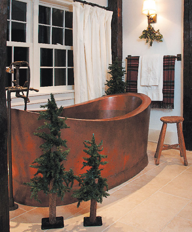Bathing Beauty | Even the master bath, with its curvaceous copper spa tub, gets dressed for the holidays.