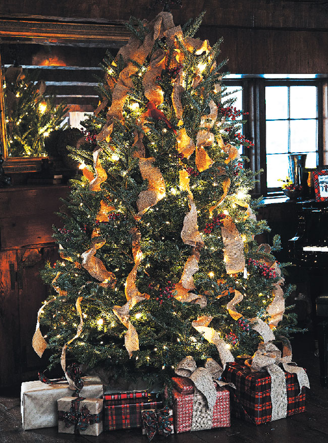Beribboned Beauty | The Oster family Christmas tree is decorated in simple but classic style with burlap ribbons and clusters of red berries.