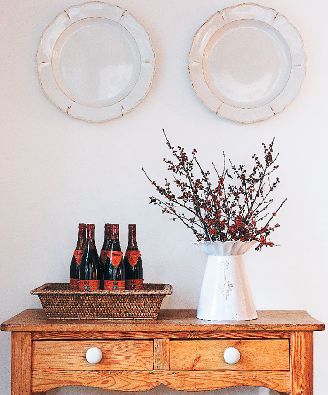 Vintage Vignettes | A white vase filled with pepperberries sits atop a pine table in the kitchen.