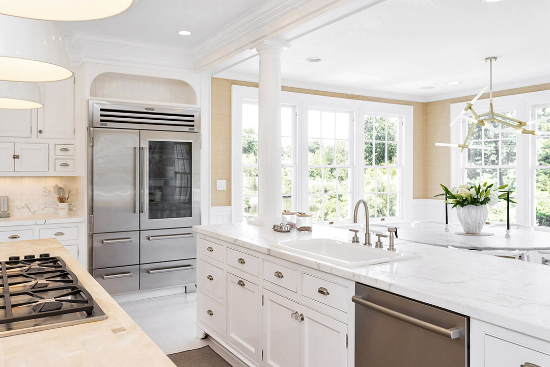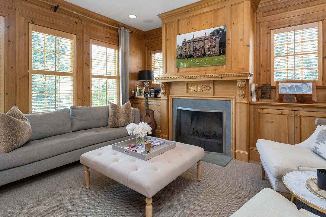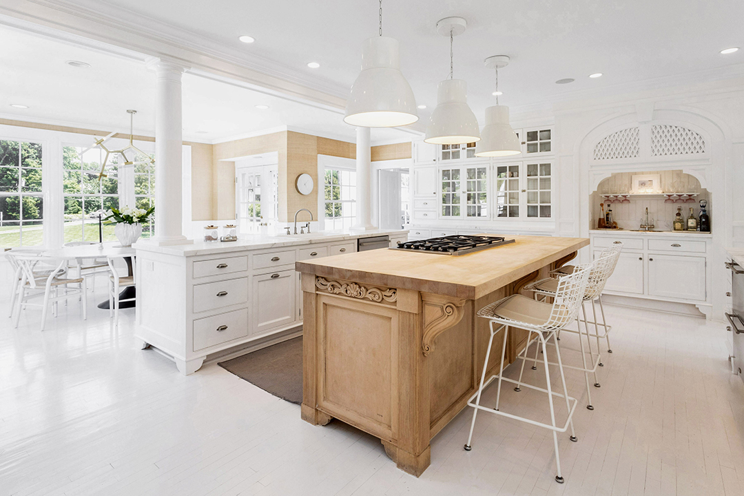 The home’s recent reimagination spared no expense, bringing cozy living spaces and a beautiful chef’s kitchen to fruition. For those looking to enhance their cooking, the stunning kitchen is anchored around a central wood island, while top-of-the-line appliances offer a seamless experience.