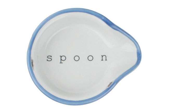 Sporting the look of vintage metal cookware, Canvas Home’s Tinware spoon rest is made of stoneware, complete with authentic distressed edges and a contrasting blue rim. $10, NYC, 212-372-7706, canvashomestore.com.