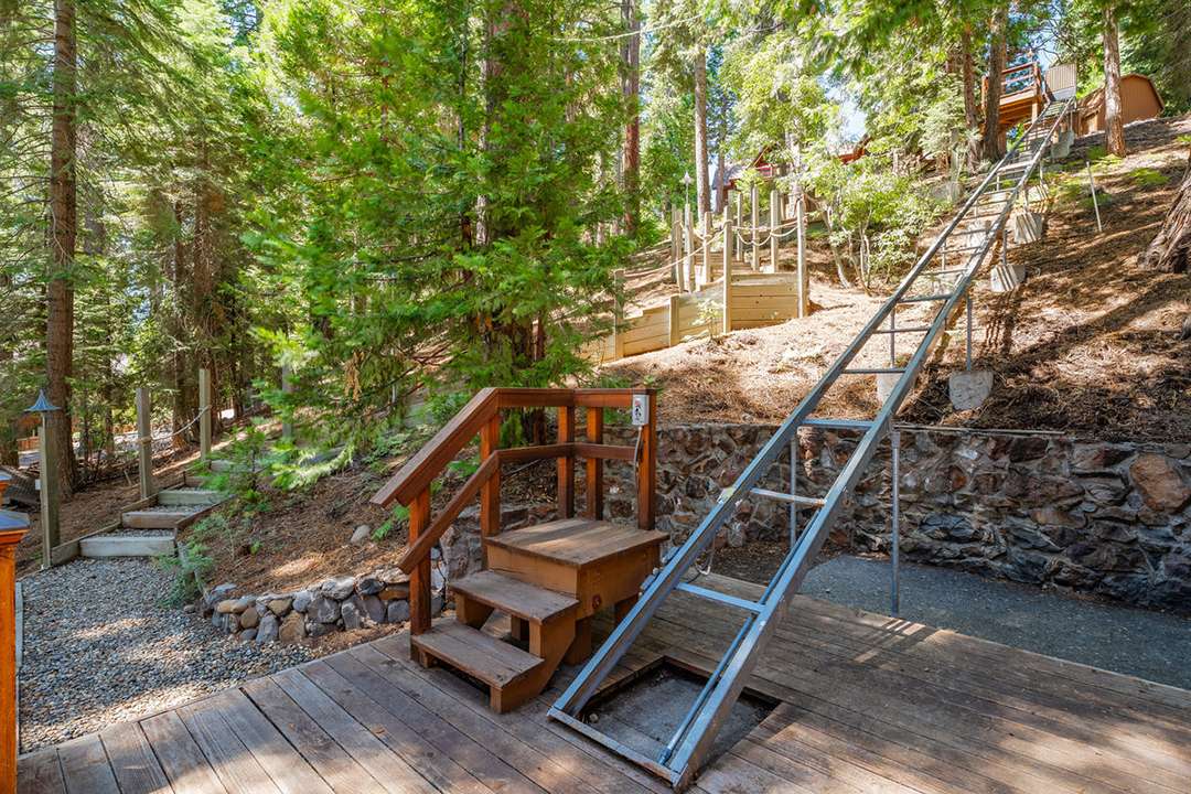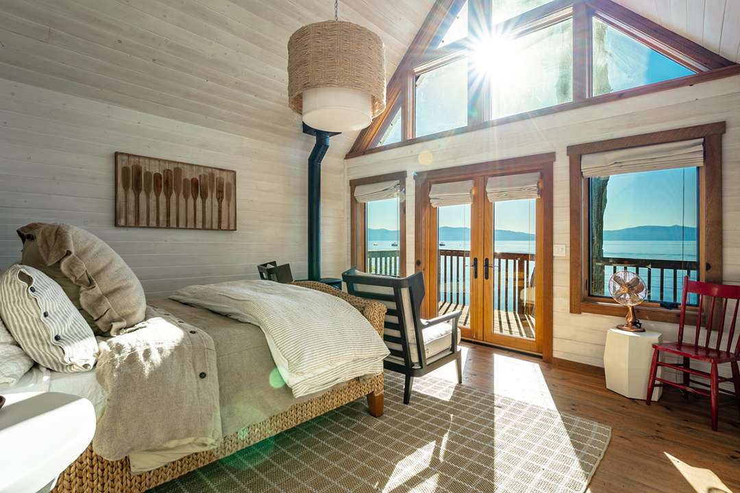 Add in the upper two houses and the property holds seven bedrooms in total: Plenty of room for a big brood of guests. Tosh quips, “My in-laws love to visit so having multiple, separate cabins ensured I could maintain my Tahoe tranquility.” A funicular, harkening to the chair lifts that go up mountains nearby, can take you back and forth between the two larger homes for an added pinch of charm.