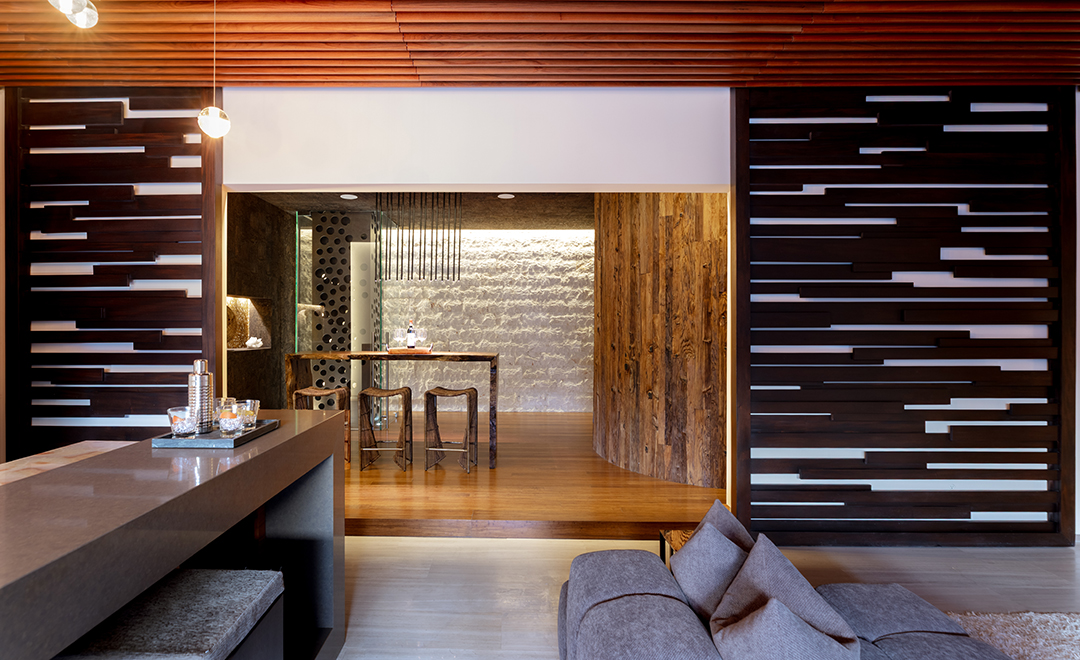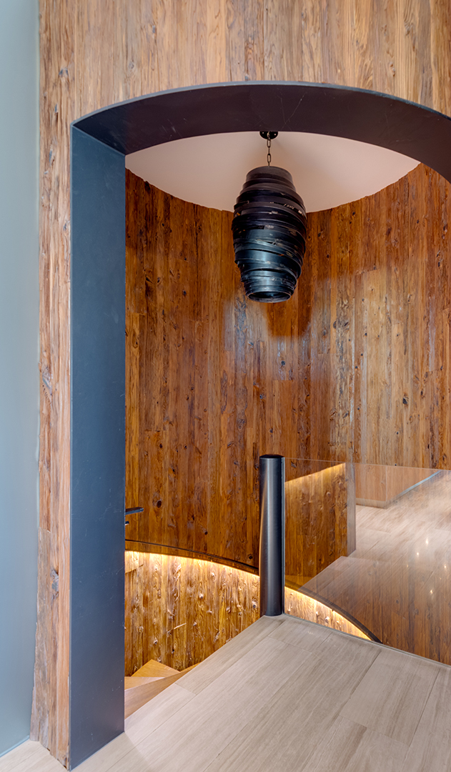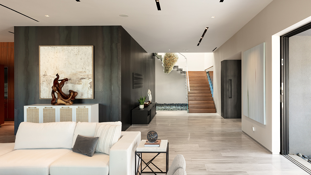 Serving up six bedrooms and eight bathrooms across 8,244 square feet, the desert estate is comprised of a four-bedroom main house and a two-bedroom guest house. Inside, guests enter through the second level, where the open floor plan introduces both the dining room and living room. An abundance of natural light pours into the spaces, and its neutral palette draws on an elemental theme through materials like stone, marble, and granite. A functional two-story sculpture made of lightbulbs hangs in the staircase leading up to the top floor, where the bedrooms, including the primary suite, are situated. A separate staircase clad in trunk-like wood spirals down to the “moodier” lower level with exposed stone walls, which is a host’s dream, consisting of a full bar, sitting area, and wine cellar. Architect Eric Strain at Assemblage Studio devised the design feat.