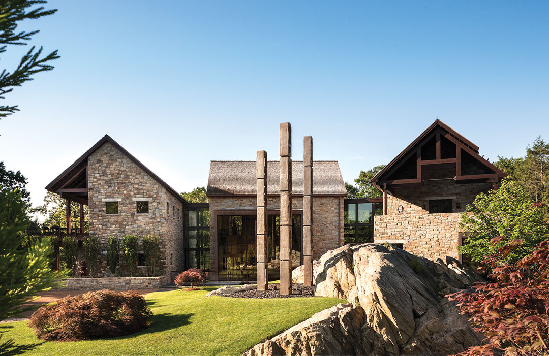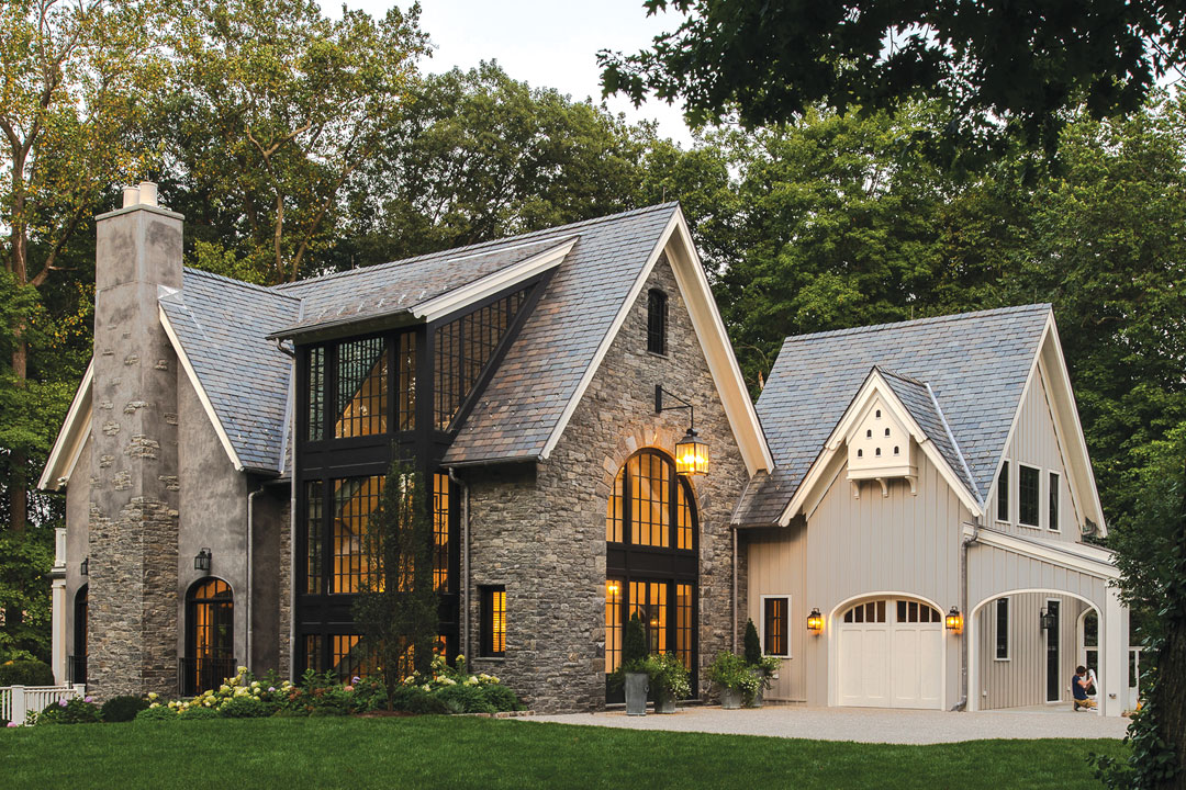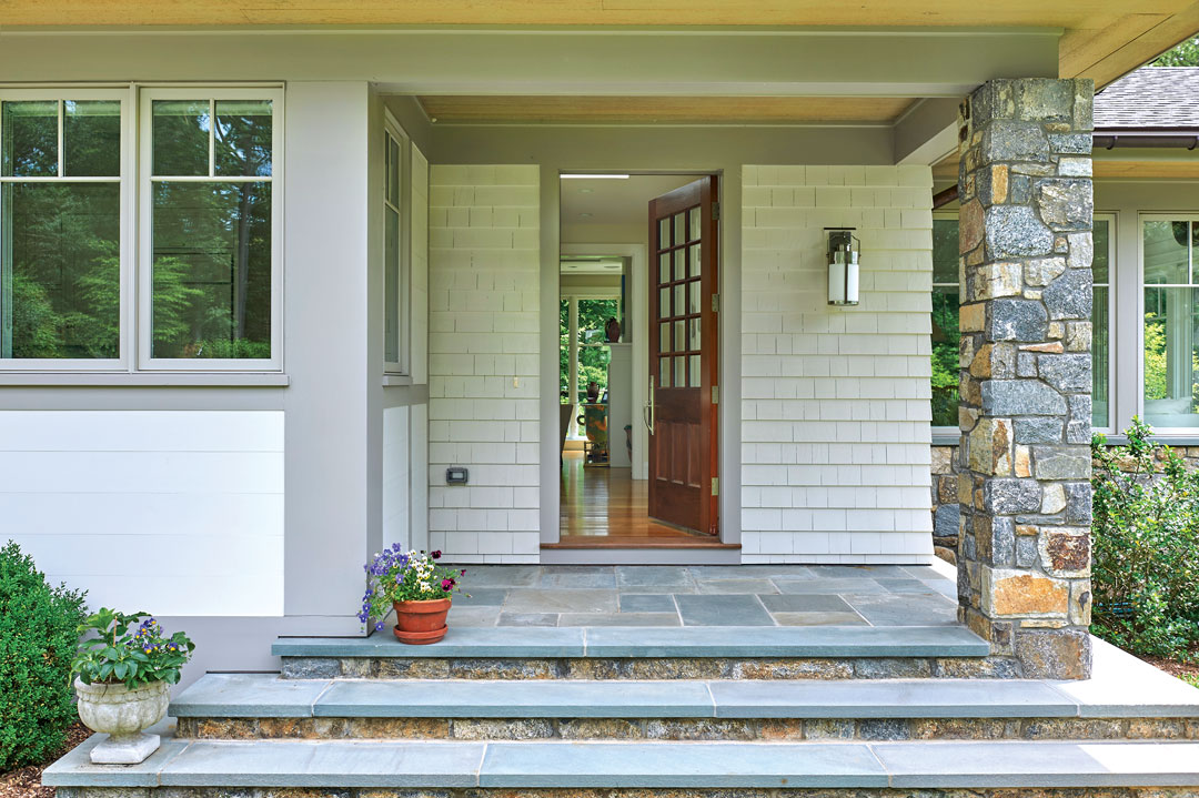 The front entry of this new Connecticut residence reflects the influence of the Arts and Crafts movement. Natural exterior finishes blend textures and colors from the site, while open and light-filled spaces inside capture views of the owner’s extensive gardens. Rob Sanders Architects of Wilton integrates careful site planning and thoughtful architectural design to create distinctive, comfortable, and natural homes in Connecticut, New York and beyond.