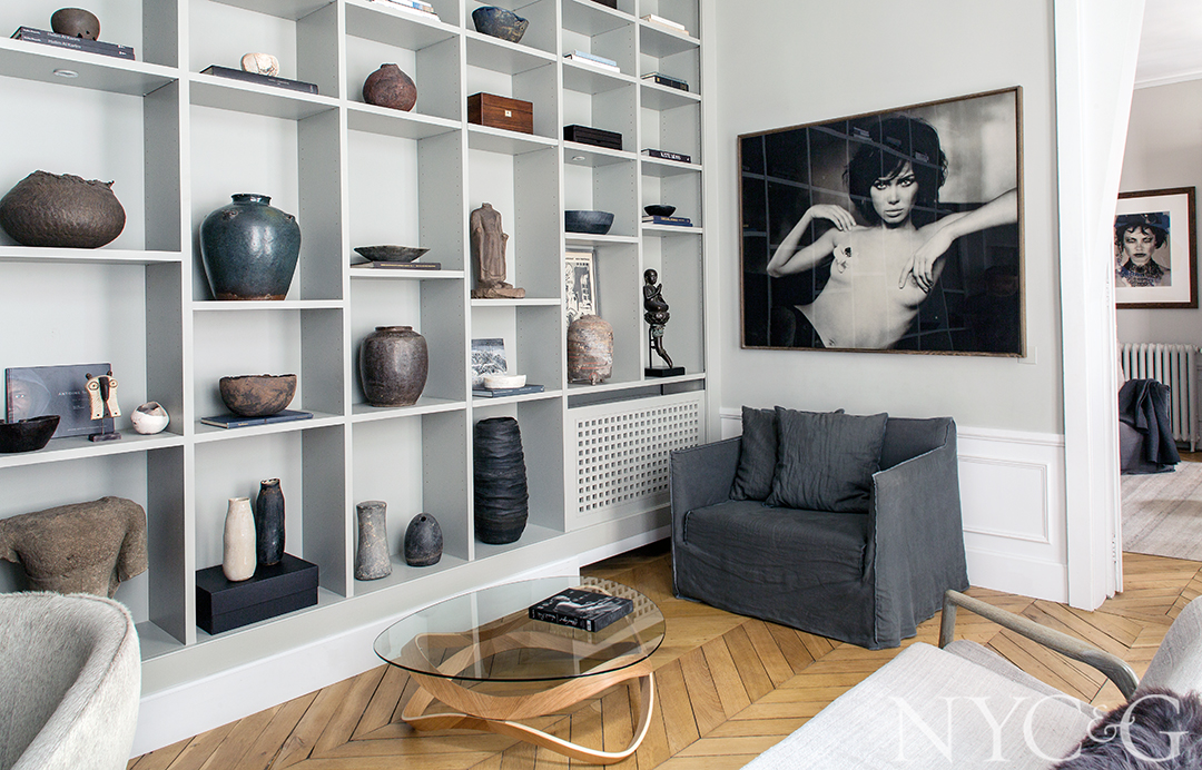 In the living room of the enfilade apartment, an ancient wooden door and a Patrik Andersson black-and-white photograph of Kate Moss flank the entry to the sitting room beyond.