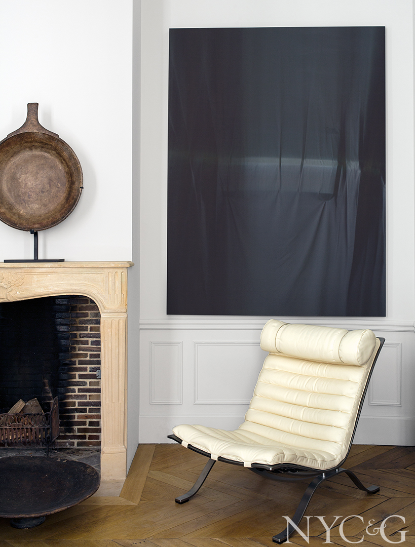 In the living room, a work by Chris Duncan is mounted above a vintage leather-upholstered Arne Norell Ari chair.