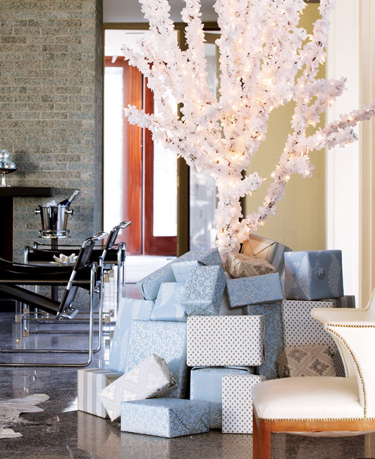 Perhaps designer Jason DePierre liked the “contemporary version of a traditional Christmas tree” he designed for the New Canaan home in “Haute Holiday” (C&G Holiday) so much because he had to make it twice… The day after DePierre and his team removed all of the “Homes for the Holidays” decorations from the Bridge House, CTC&G called and asked to shoot it! They recreated the entire room for the shoot, including re-wrapping each branch of the Dogwood tree with white Christmas lights and garlands of white flowers. “After doing it twice,” he says, “I feel like an expert!” To find out how to make your own modern Christmas tree, check out “Contemporary Christmas Tree How-To.”